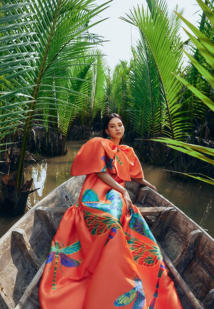 Với bố cảnh đồng lúa, Tiểu Vy hóa quý cô thành thị với áo quây, phối với chân váy chữ A và vest oversize. Họa tiết chủ đạo trong bộ sưu tập này là những chú chuồn chuồn sắc màu được cách điệu bắt mắt trên sắc cam.