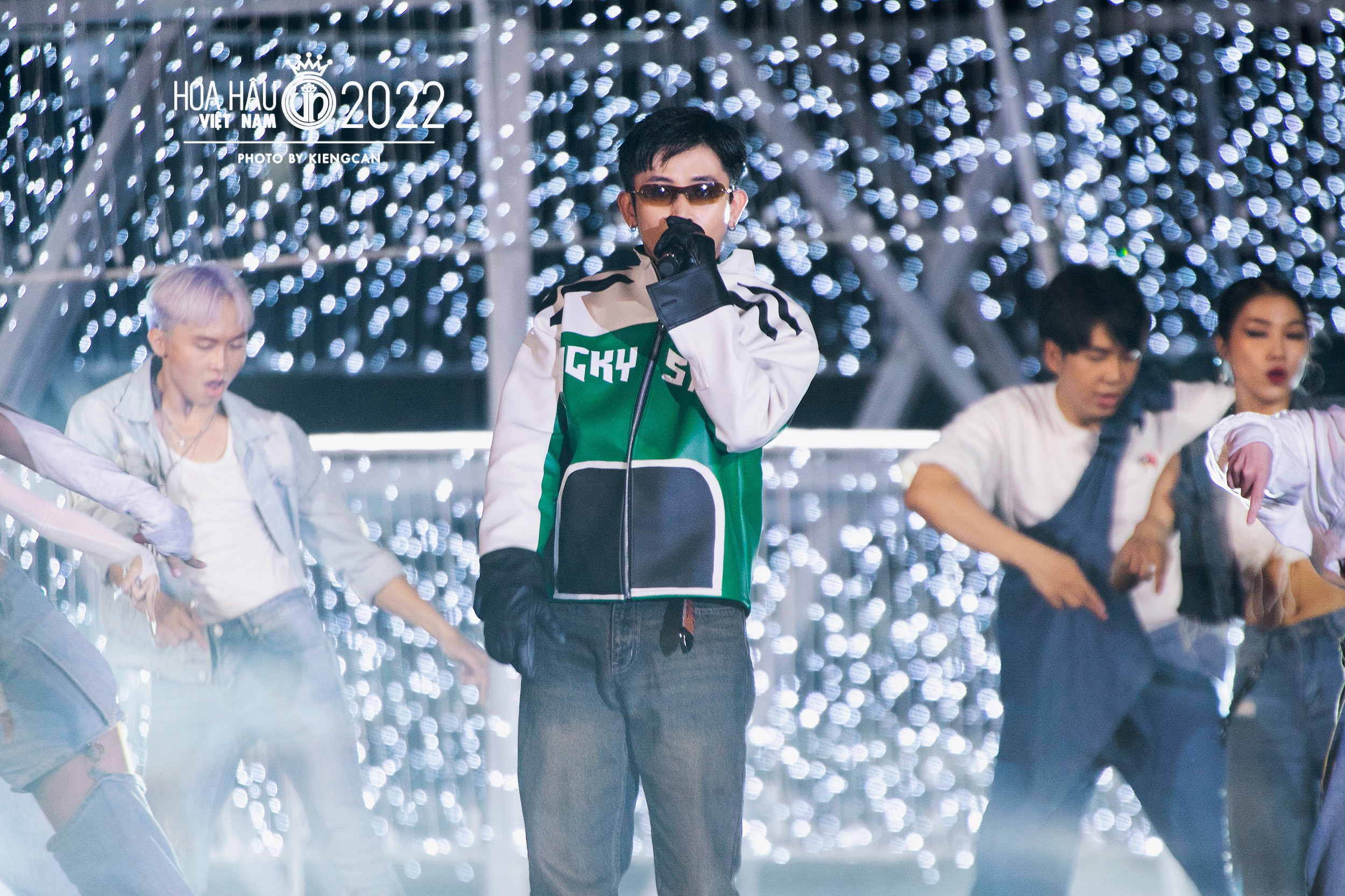 Mở đầu là màn đồng diễn của Top 35 Hoa hậu Việt Nam 2022 trên nền nhạc “Lúc lắc” và “Con nhà người ta” của Ricky Star. Các người đẹp diện trang phục khỏe khoắn kết hợp với chân váy xòe trên gối cùng giày thể thao.