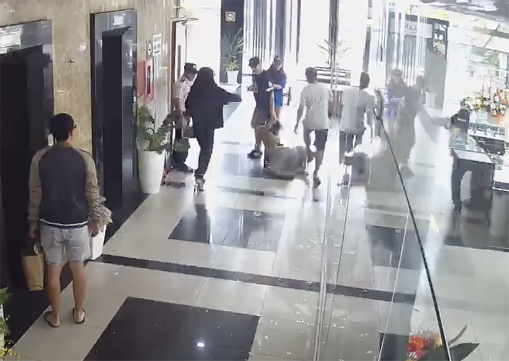Theo clip phán ảnh, 2 người phụ nữ bước ra từ thang máy tầng trệt chung cư thì có một nhóm người ngồi đợi sẵn ở sảnh và xông tới hành hung. Trong nhóm người này, chủ yếu là cặp nam nữ lao vào hành hung cô gái mặc áo thun vàng.