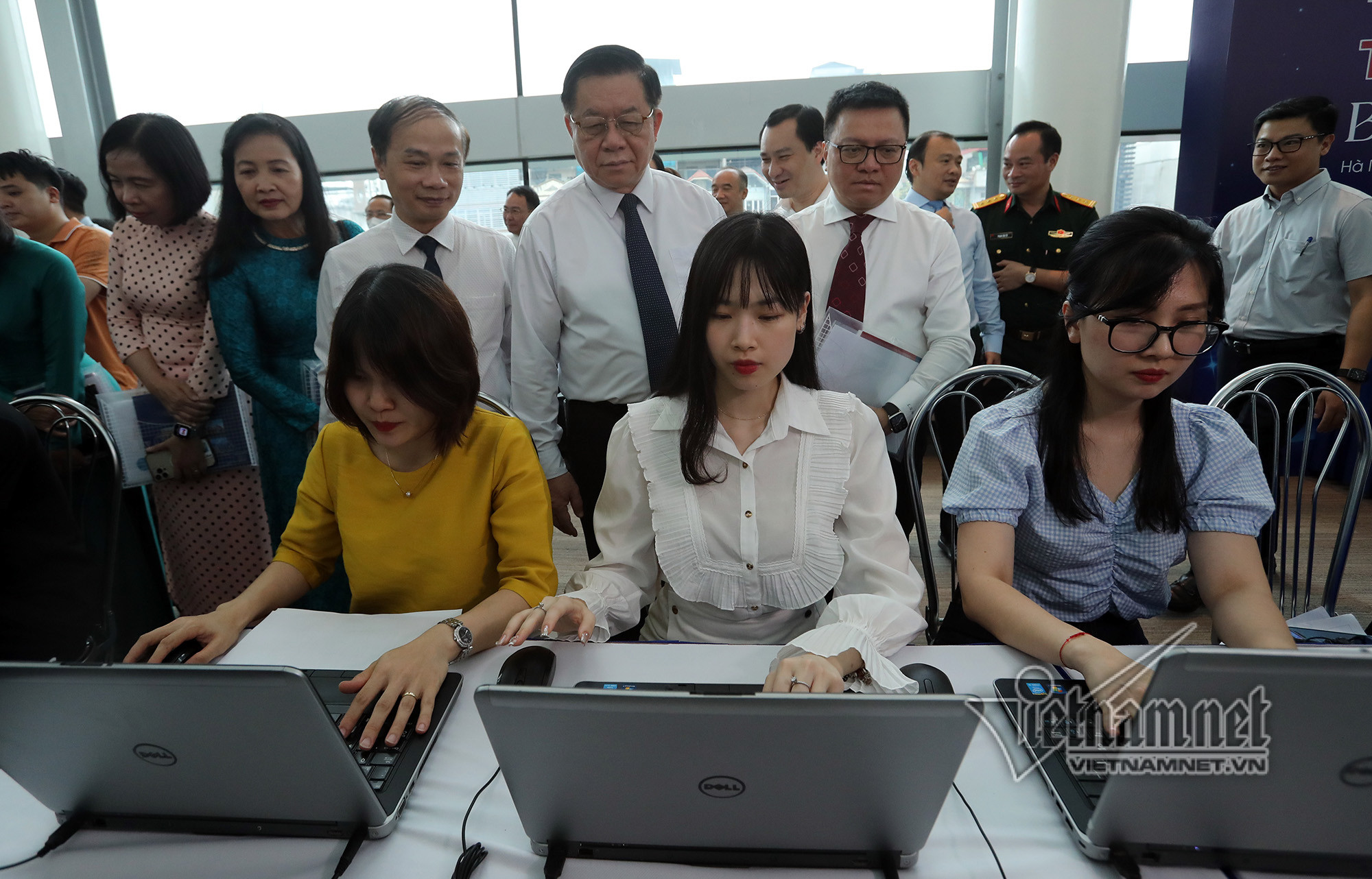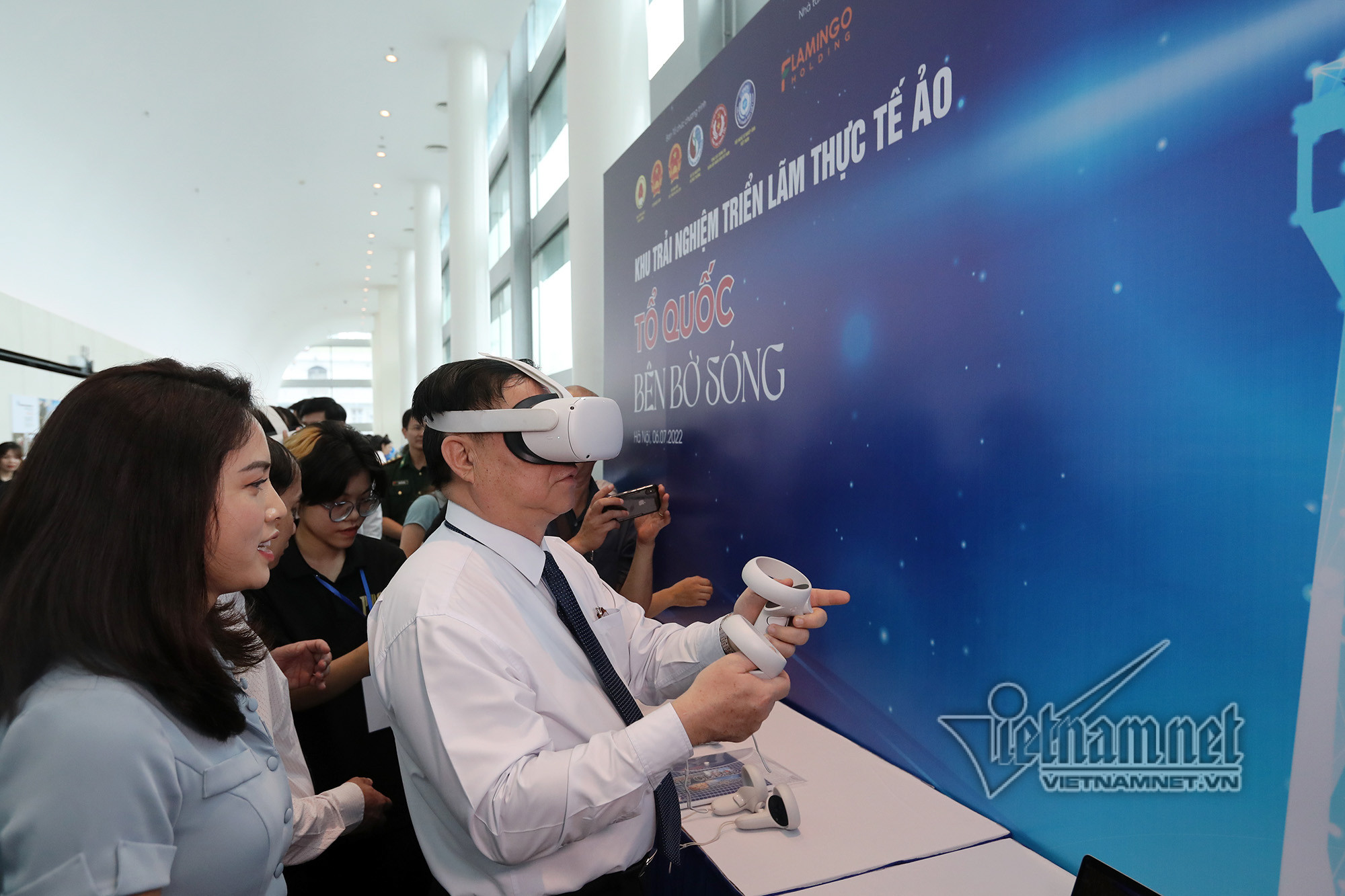 Trưởng Ban Tuyên giáo Trung ương Nguyễn Trọng Nghĩa trải nghiệm thực tế ảo tại triển lãm.