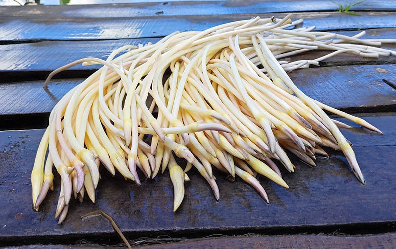 Những mầm non trắng ngần ẩn mình dưới bùn nước được nhà đầm thu hái rồi đem bán. Đây chính là ngó sen, loại rau đặc sản chỉ có vào mùa hè.