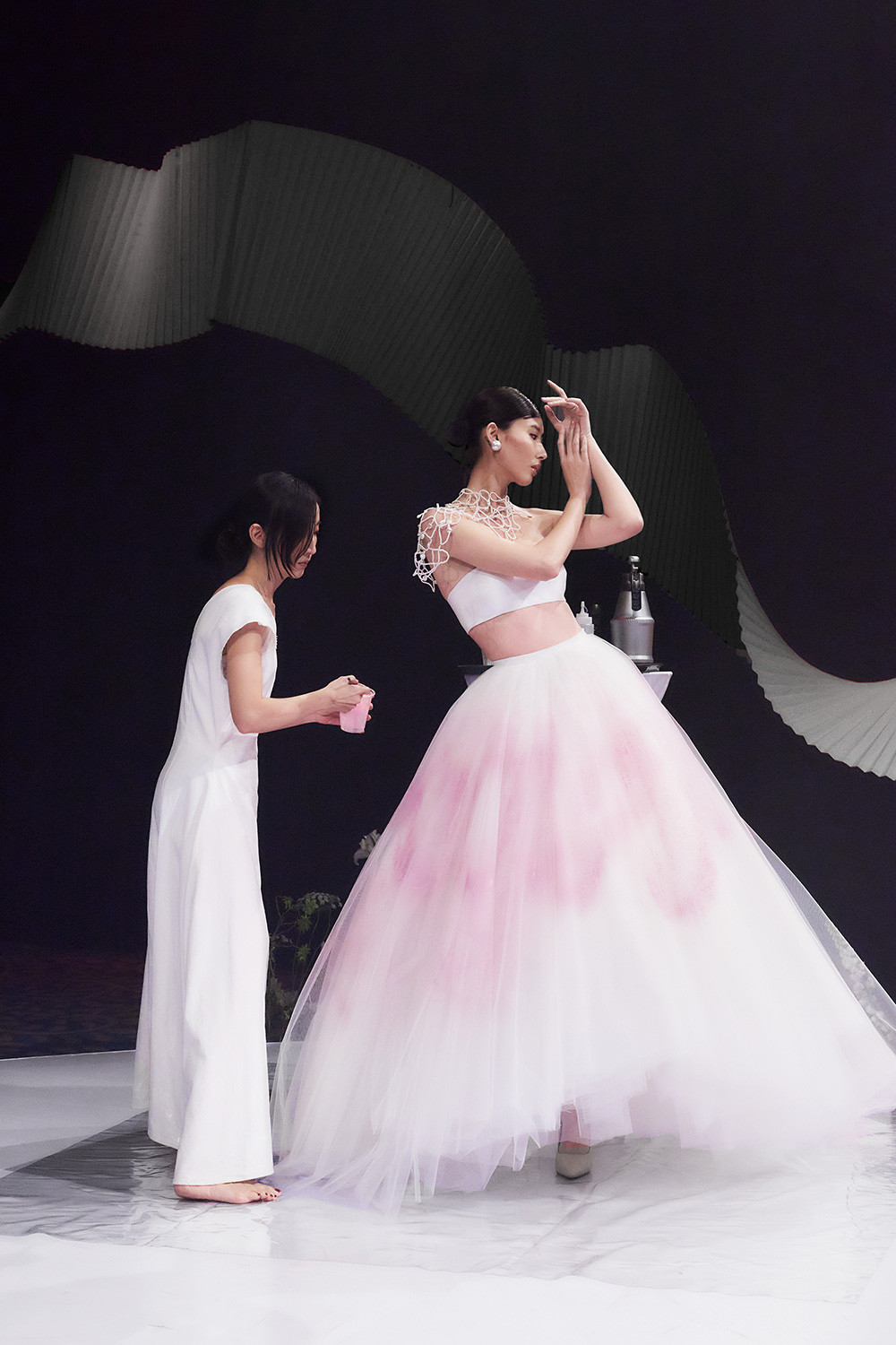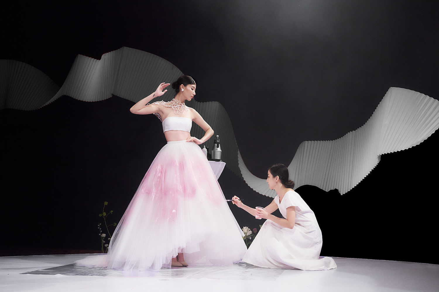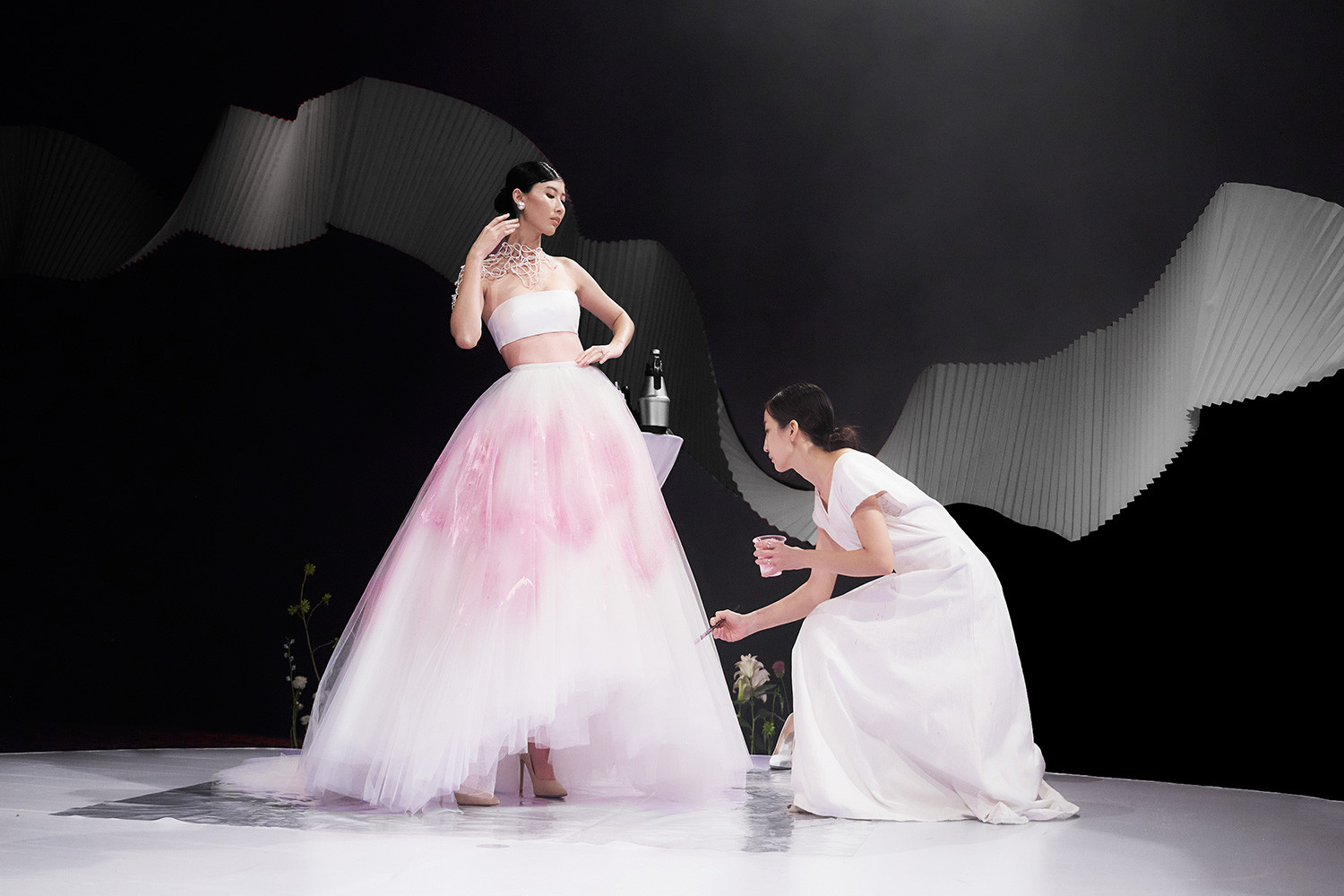Trong buổi giới thiệu bộ sưu tập mới của NTK Quỳnh Anh, hoạ sĩ Susan Shin đã mang đến màn Art Performance đặc biệt khi vẽ trực tiếp lên váy cưới ngay trên sân khấu.