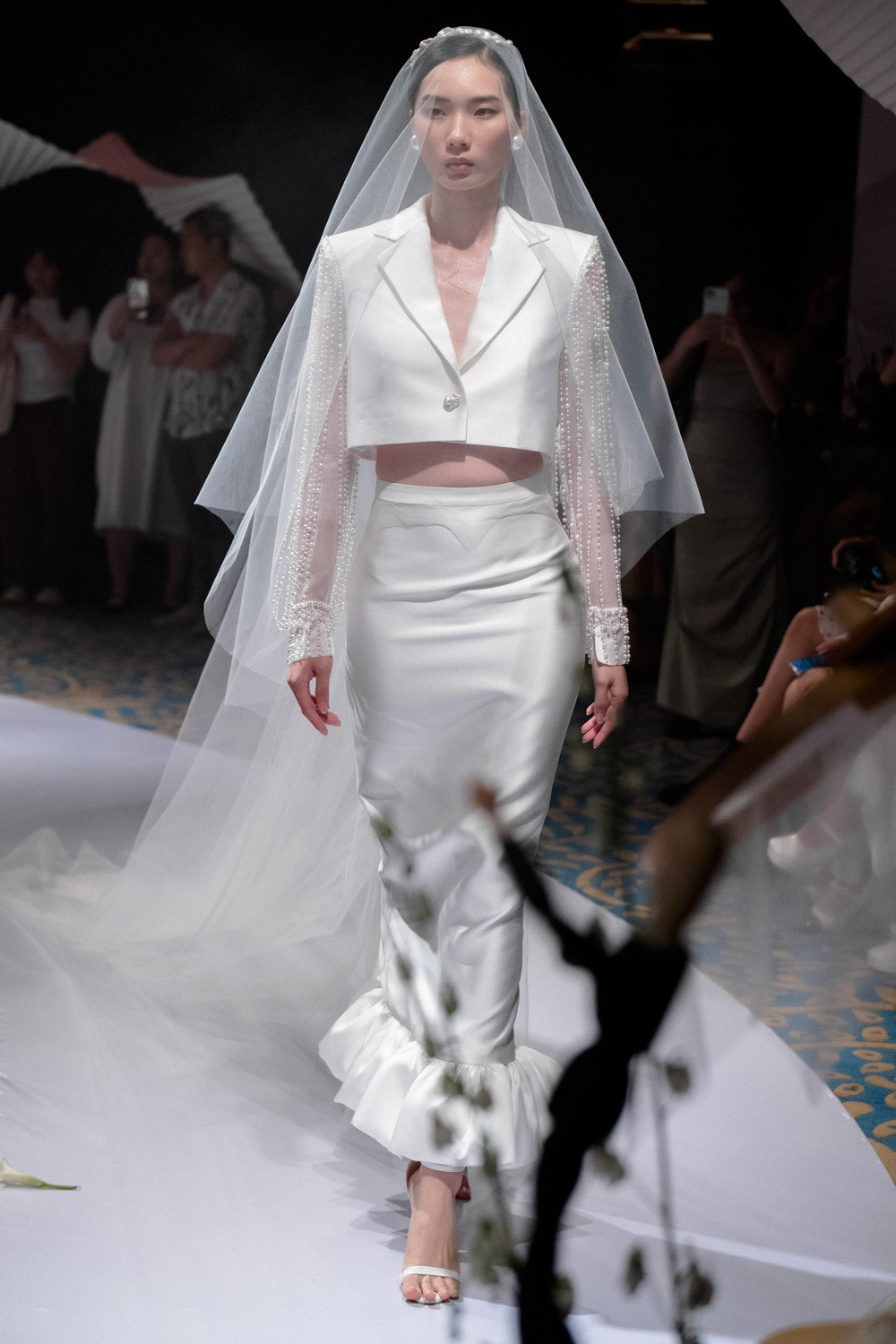 NTK Quỳnh Anh mang đến màn trình diễn ấn tượng với sự xuất hiện của nghệ sĩ Hàn Quốc Susan Shin. Cô là một nghệ sĩ trừu tượng của Hàn Quốc, đang sống và làm việc tại Hà Nội, có 10 năm học chuyên ngành thiết kế thời trang. Đặc trưng trong các tác phẩm hội họa của Susan là thể hiện sự mãnh liệt đi kèm với cảm giác ấm áp, mộng mơ thông qua trí tưởng tượng phong phú.Trong buổi trình diễn, NTK Quỳnh Anh và Susan Shin đã kết hợp mang đến màn Art Performance đặc biệt là sáng tạo váy cưới ngay trên sân khấu.Mở màn, người mẫu xuất hiện trong thiết kế của Quỳnh Anh với mẫu đầm cưới trắng tinh khôi. Nghệ sĩ Susan Shin vẽ trực tiếp màu acrylic trên nền chiếc váy đầy ngẫu hứng và sáng tạo. Xuyên suốt màn sáng tác này, các người mẫu lần lượt giới thiệu 15 thiết kế trong bộ sưu tập mới của Quỳnh Anh. Khi những người mẫu hoàn thành phần catwalk, cũng là lúc chiếc đầm cưới vẽ trừu tượng của Susan Shin được hoàn thiện, tạo nên tiết mục trình diễn đầy thu hút.Theo quan niệm của NTK Quỳnh Anh, hội họa và thời trang luôn gắn kết, nuôi dưỡng lẫn nhau như cuộc giao thoa đầy thi vị của cái đẹp. Đỉnh cao của sự xa xỉ trong thời trang là sự giao thoa giữa kỹ thuật làm váy cưới tỉ mỉ và hội họa, từ đó tạo nên những mẫu váy cưới sống động như một tác phẩm nghệ thuật độc bản dành tặng cho các cô dâu.