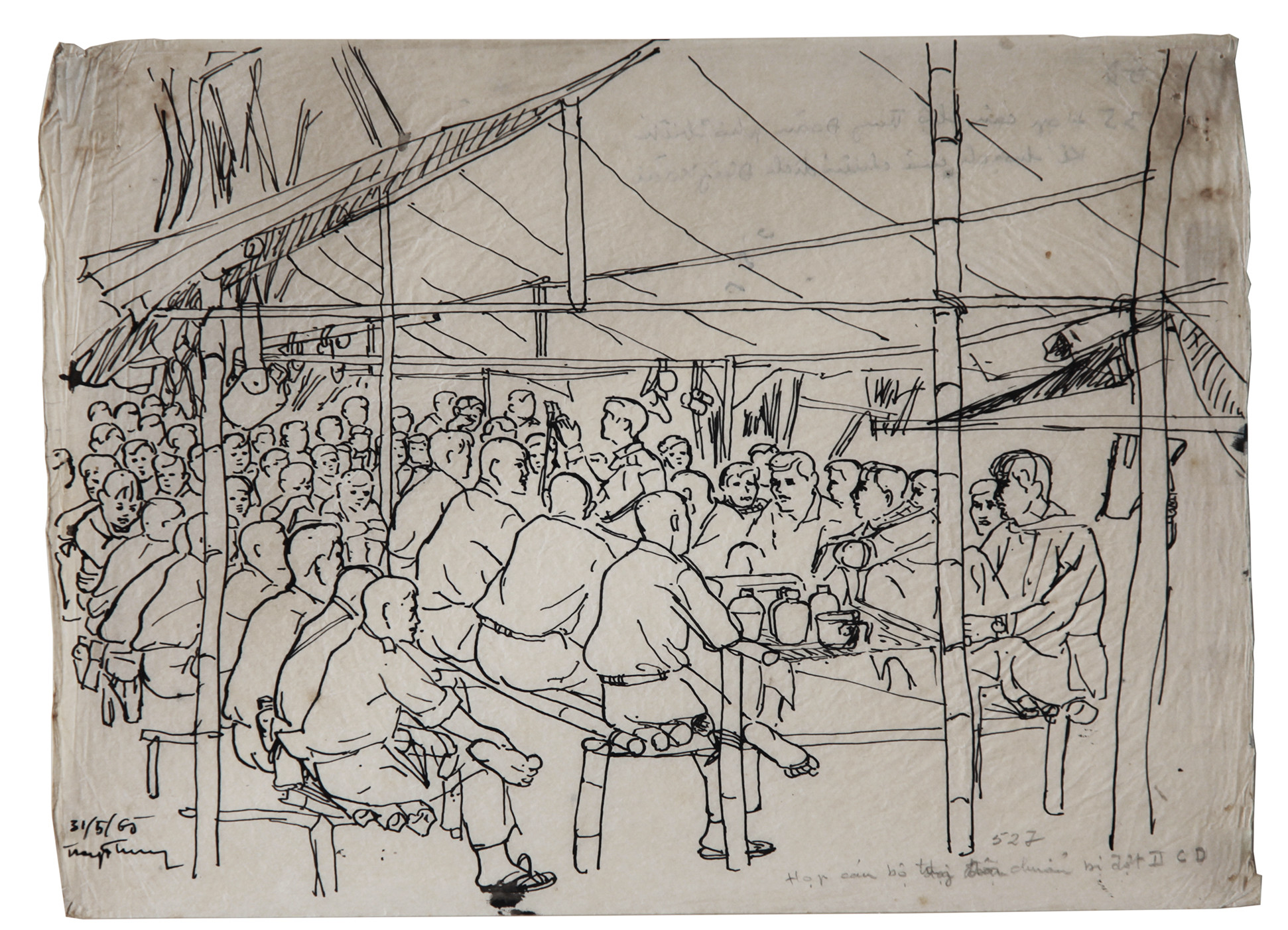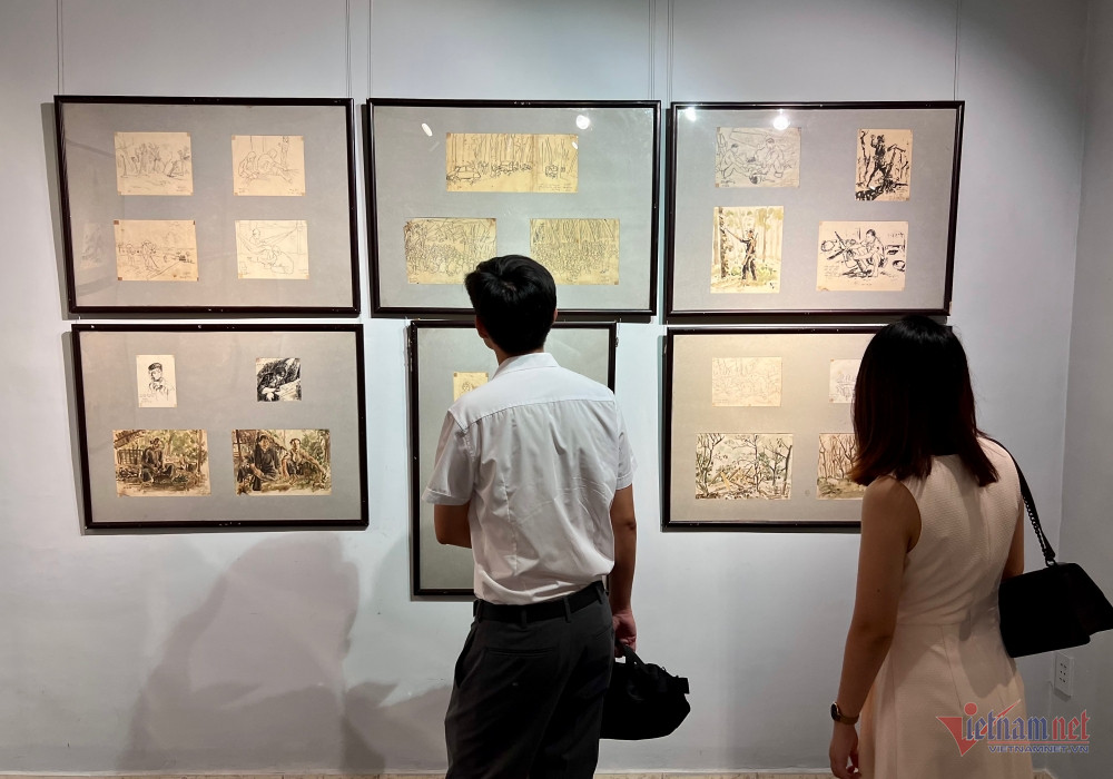Khán giả thưởng lãm tranh ký họa được họa sĩ vẽ trong thời chiến.