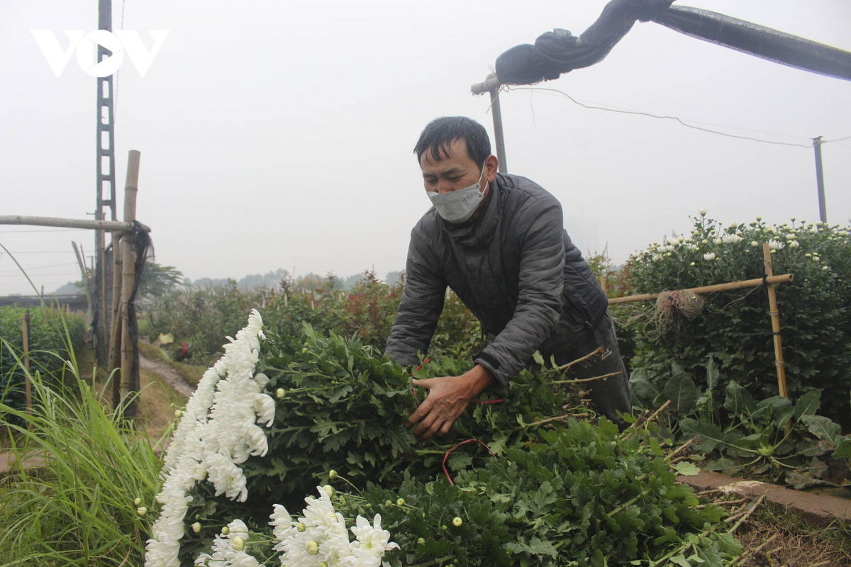 Người dân Tây Tựu cắt hoa tại vườn để kịp thương lái đến lấy hàng. |