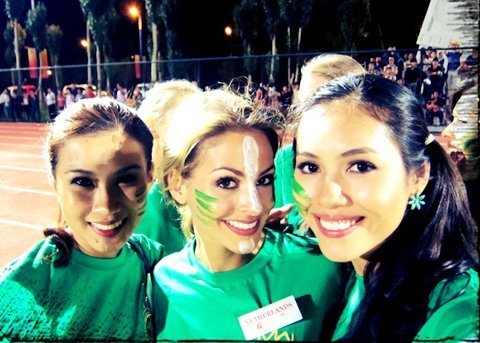 | Hoàng My (ngoài cùng bên phải) vẽ mặt giống các thí sinh để cùng cổ vũ cho đội mình. |