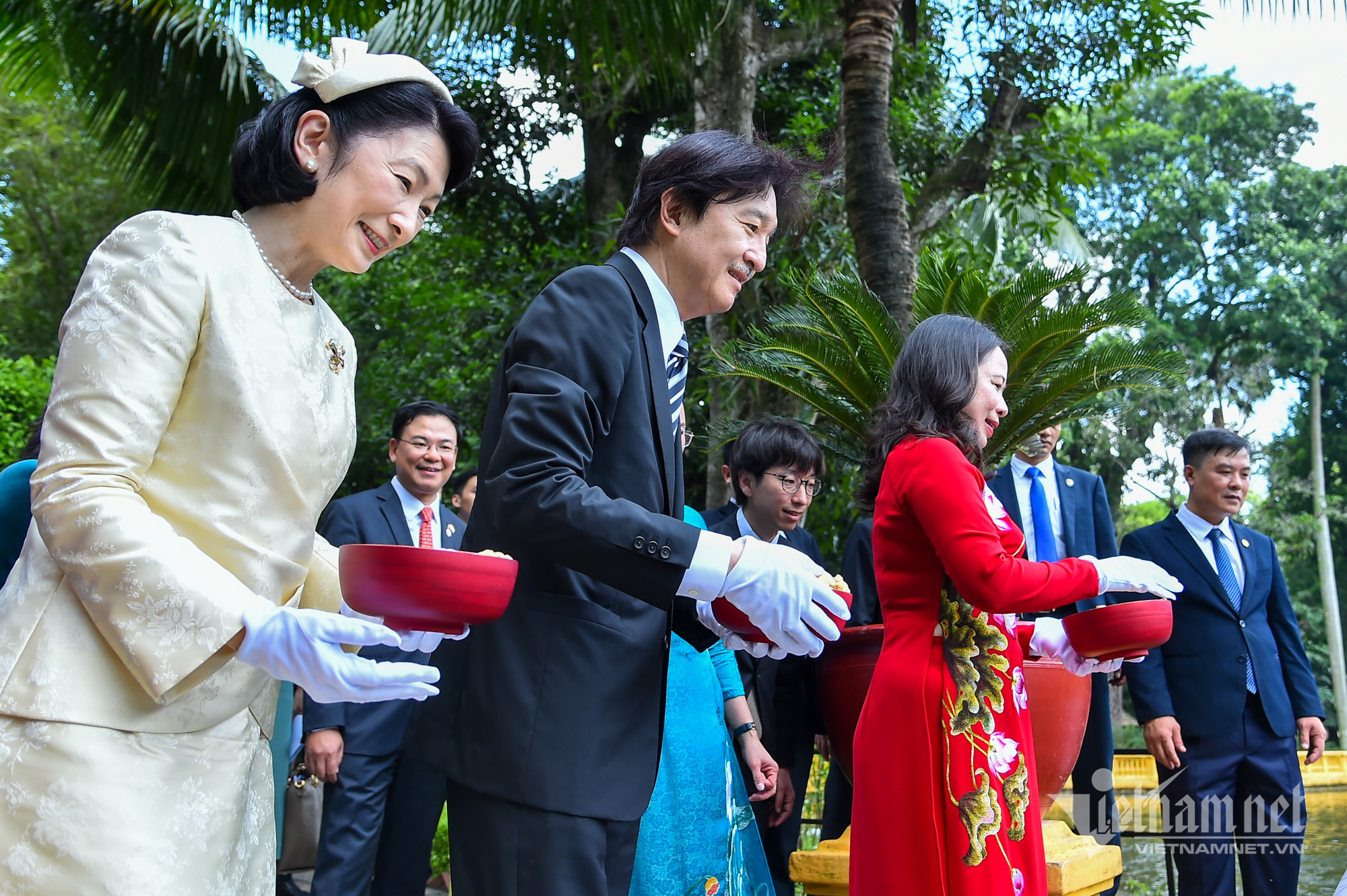Hoàng Thái tử và Công nương đã nghe giới thiệu về nơi ở, nơi làm việc của Bác Hồ lúc sinh thời, sau đó Phó Chủ tịch nước cùng hai vị khách quý đã tới cho cá ăn tại Ao cá Bác Hồ.
