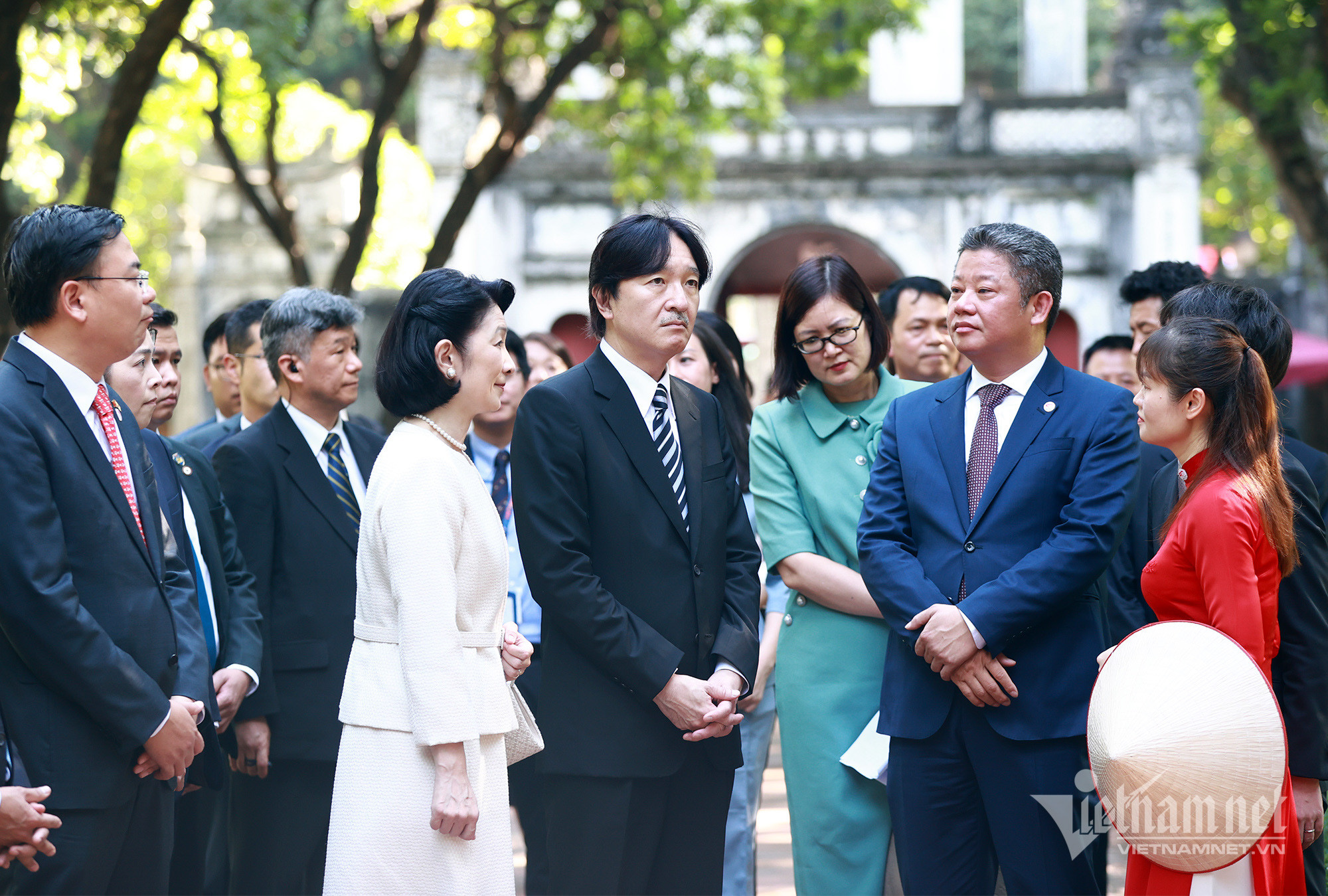 Trong khuôn khổ chuyến thăm Việt Nam, chiều 21/9, Hoàng Thái tử Nhật Bản Fumihito Akishino và Công nương Kawashima Kiko tới thăm Văn Miếu - Quốc Tử Giám - trường đại học đầu tiên của Việt Nam. Cùng đi có Phó Chủ tịch UBND TP Hà Nội Nguyễn Mạnh Quyền.