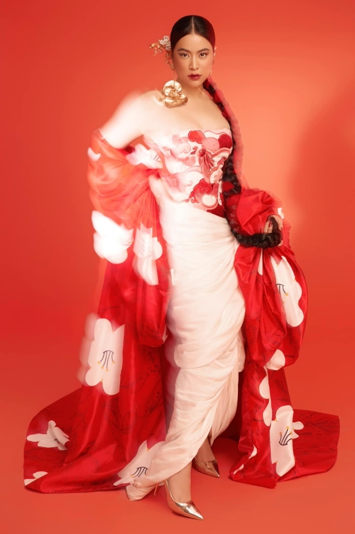 | Hoàng Thuỳ Linh cuốn hút trong hình tượng Thuý Kiều với phong cách dân gian đương đại và gam màu đỏ rực mạnh mẽ làm chủ đạo. Bộ cánh quây ngực cùng phần tùng xoắn nếp vừa tôn vòng 1 đầy đặn đồng thời mang lại sắc thái sang trọng, đài các. Hoạ tiết in điểm xuyết được đan xen cùng thủ pháp đính kết tạo điểm nhấn 3D ấn tượng cho thị giác. Nữ ca sĩ tết tóc dài và lựa chọn phụ kiện ánh vàng bất đối xứng. |