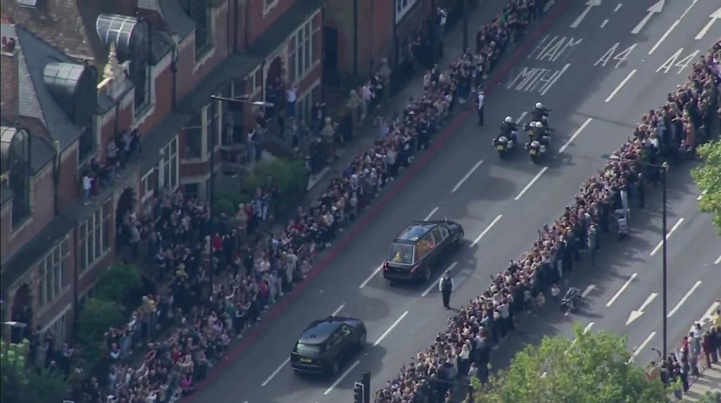 Tại London, hàng nghìn người đã xếp hàng dài trên đường phố để chứng kiến cảnh linh cữu của Nữ hoàng được đưa từ Đại sảnh Westminster lịch sử tới Tu viện Westminster rồi sau đó tới Lâu đài Windsor, nơi bà sẽ an nghỉ bên người chồng quá cố.