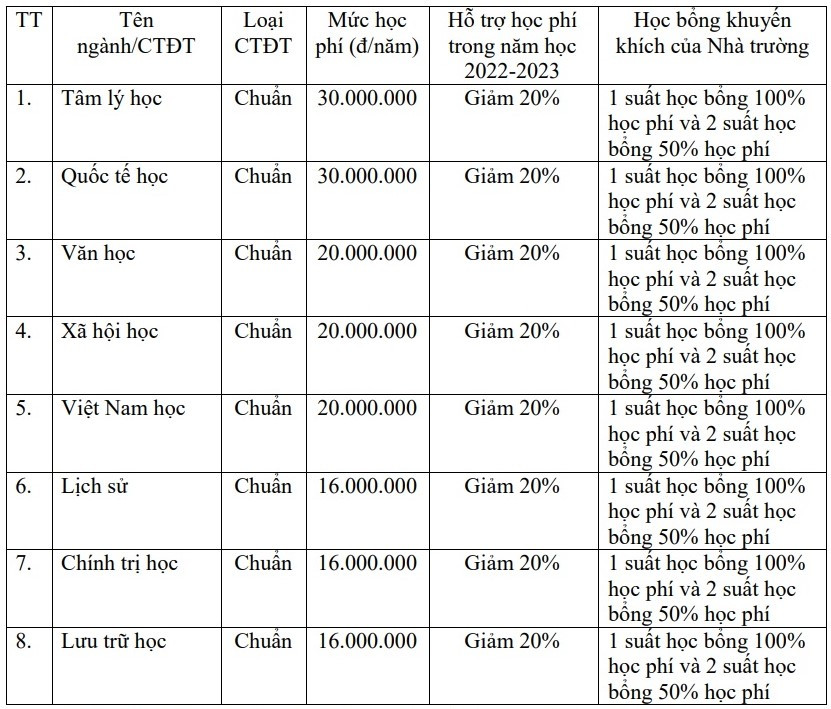 Ngoài ra, học phí Trường ĐH Khoa học Xã hội và Nhân văn năm học 2022 – 2023 là 1,2 triệu đồng/tháng (12 triệu đồng/năm) với các chương trình đào tạo chuẩn (trừ các chương trình đào tạo đã được kiểm định chất lượng). Với chương trình đào tạo này, trường sẽ có lộ trình tăng học phí theo Nghị định số 81 của Chính phủ.