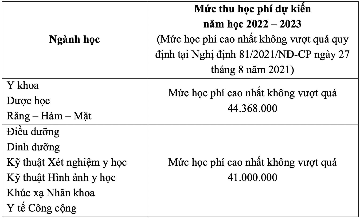 Cụ thể, học phí ngành Răng Hàm Mặt chương trình tiếng Việt năm 2022 là 105 triệu đồng/học kỳ, trong khi mức cũ là 91 triệu đồng/học kỳ. Với chương trình đào tạo bằng tiếng Anh, mức học phí tăng từ 110 triệu đồng/học kỳ lên mức 125 triệu đồng/học kỳ. Với các ngành học khác, mức tăng nhẹ hơn.