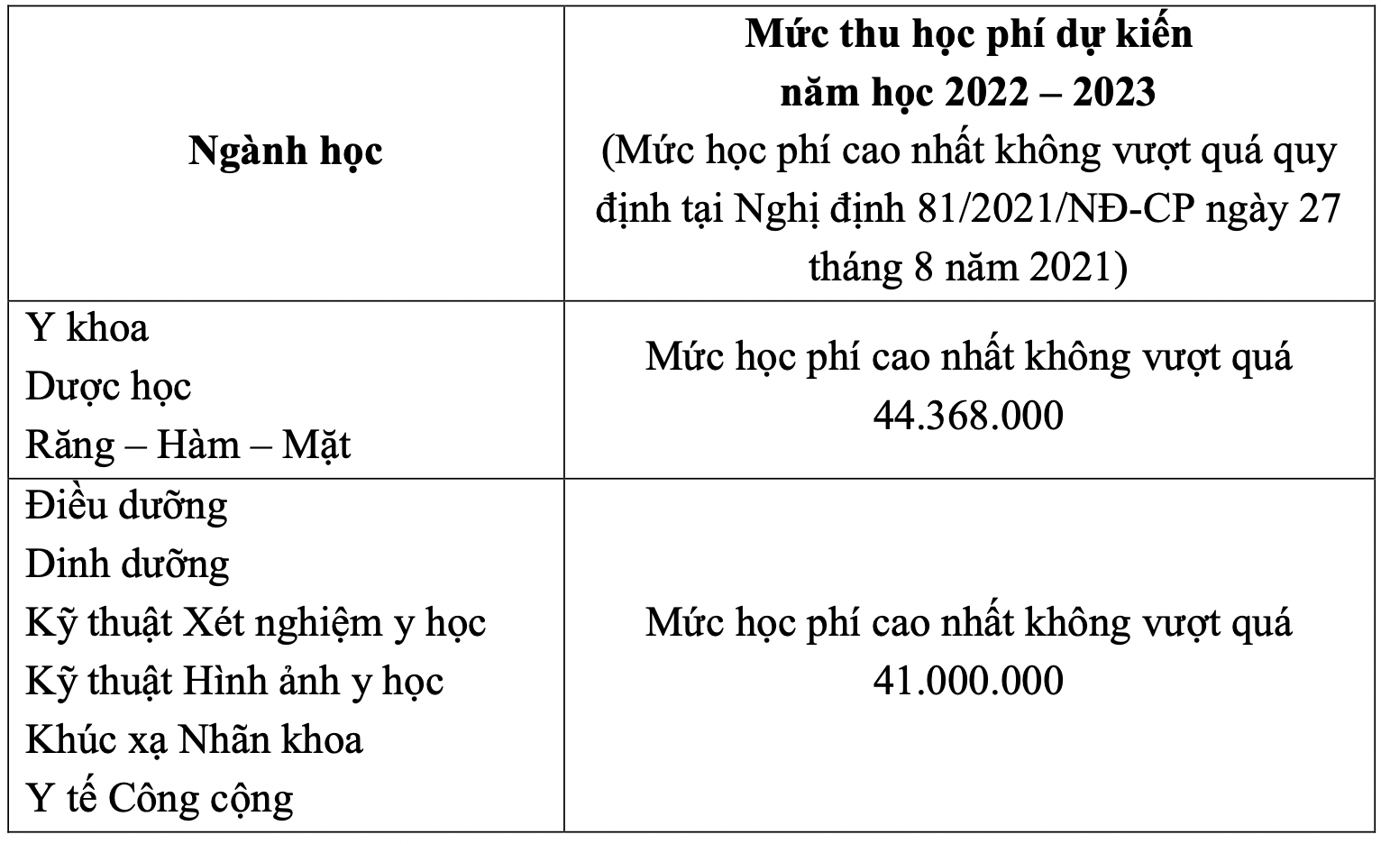 Đây là đơn giá học phí dự kiến sẽ được áp dụng trong năm học 2022–2023. Để đáp ứng sự nhu cầu cao về chất lượng nhân lực y tế khi tốt nghiệp đại học, trường tiếp tục đầu tư về cơ sở vật chất, tăng cường các chương trình hợp tác nâng cao chất lượng đào tạo, năng lực thực hành tại các cơ sở y tế, năng lực ngoại ngữ phục vụ sự phát triển nghề nghiệp cho người học. Đơn giá học phí các năm sau có thể được điều chỉnh trượt giá theo quy định.