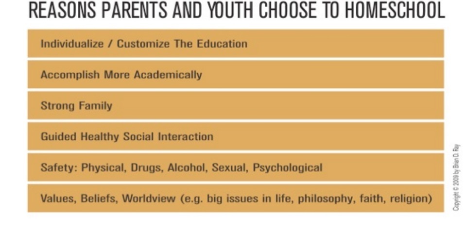 Những lý do khiến phụ huynh và những đứa trẻ chọn homeschool: tính cá nhân hóa của giáo dục, bổ sung nhiều kiến thức học thuật hơn, gây dựng mối quan hệ gia đình gắn bó , tương tác xã hội lành mạnh, an toàn, niềm tin tôn giáo... |