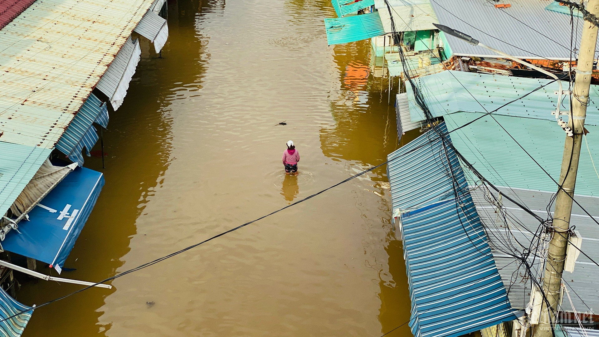 Chợ cá Thanh Hà gần đó cũng ngập sâu trong nước, tiểu thương dọn dẹp đồ đạc từ tối qua. Lực lượng chức năng dựng rào chắn ngăn người dân di chuyển.