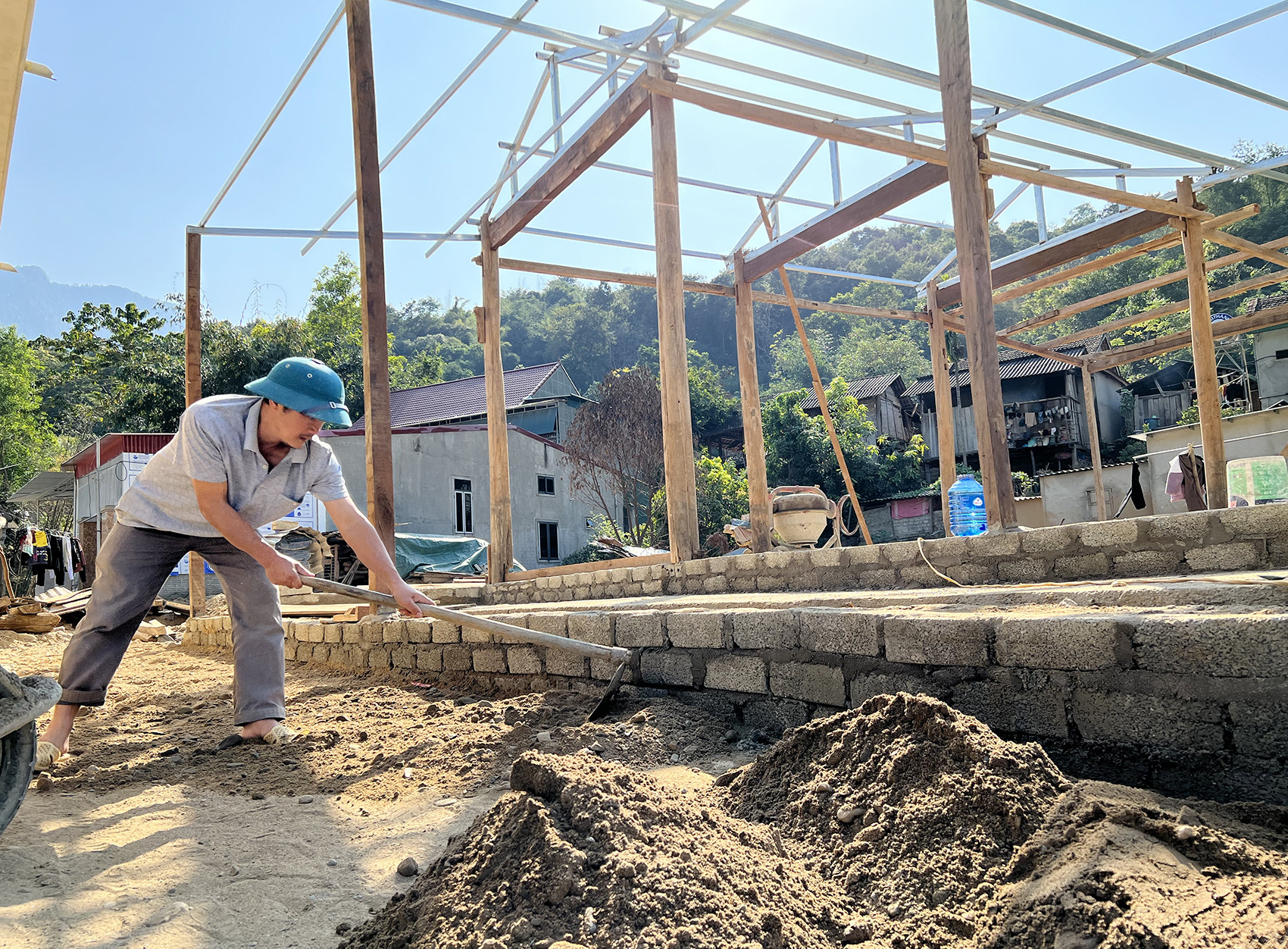 Ngôi nhà của anh Vi Văn Thông (SN 1989) là một trong số đó. Khi chúng tôi đến, anh đang cặm cụi trộn hồ, vận chuyển gạch cho ngôi nhà mới, kịp đón bé Duy Anh - cậu con trai mới sinh trở về nhà. Vợ anh sinh Duy Anh ngay trong đợt lũ hồi đầu tháng 10 năm nay.