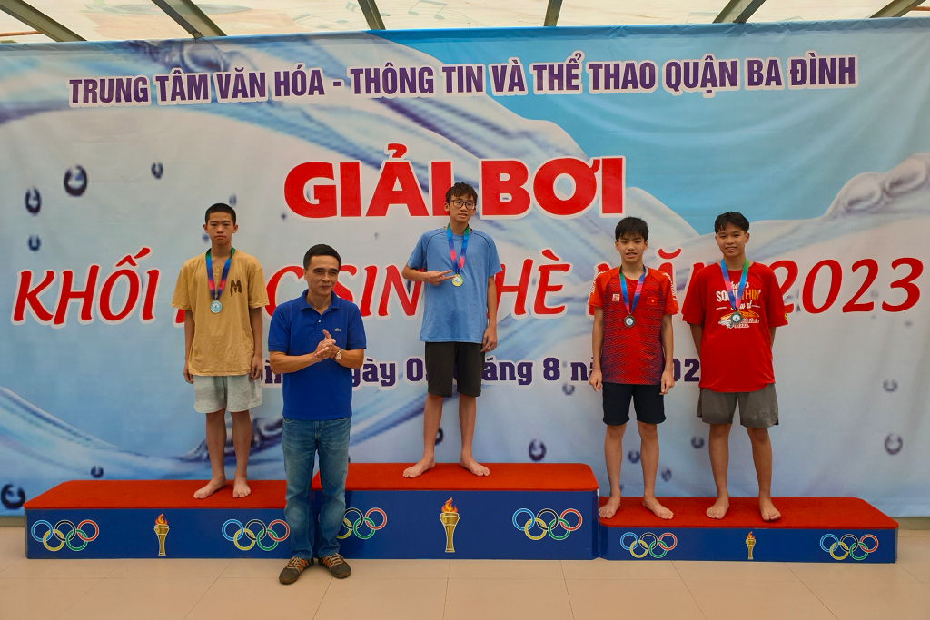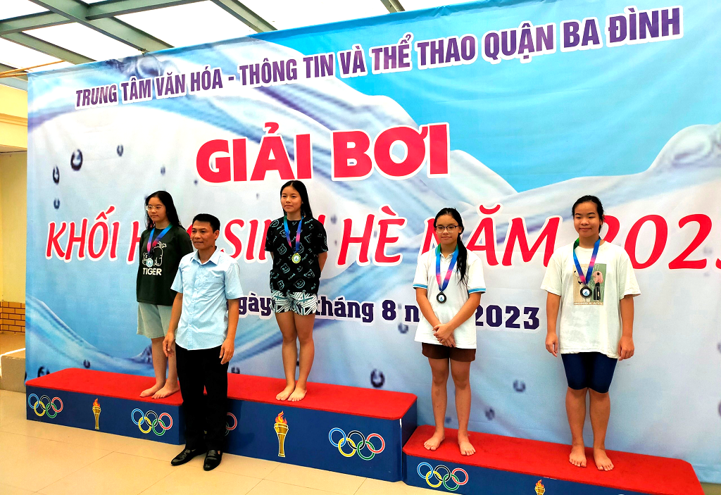 Trong số này, đội bơi của Trường THCS Giảng Võ đã xuất sắc giành 7 huy chương, trong đó có 2 Huy chương Vàng, 2 Huy chương Bạc và 3 Huy chương Đồng. Đặc biệt, ở cự li 50m Tự do nam và 50m bơi Ếch nam, học sinh Trường THCS Giảng Võ đã giành 3/4 số huy chương của nội dung thi này tại giải.