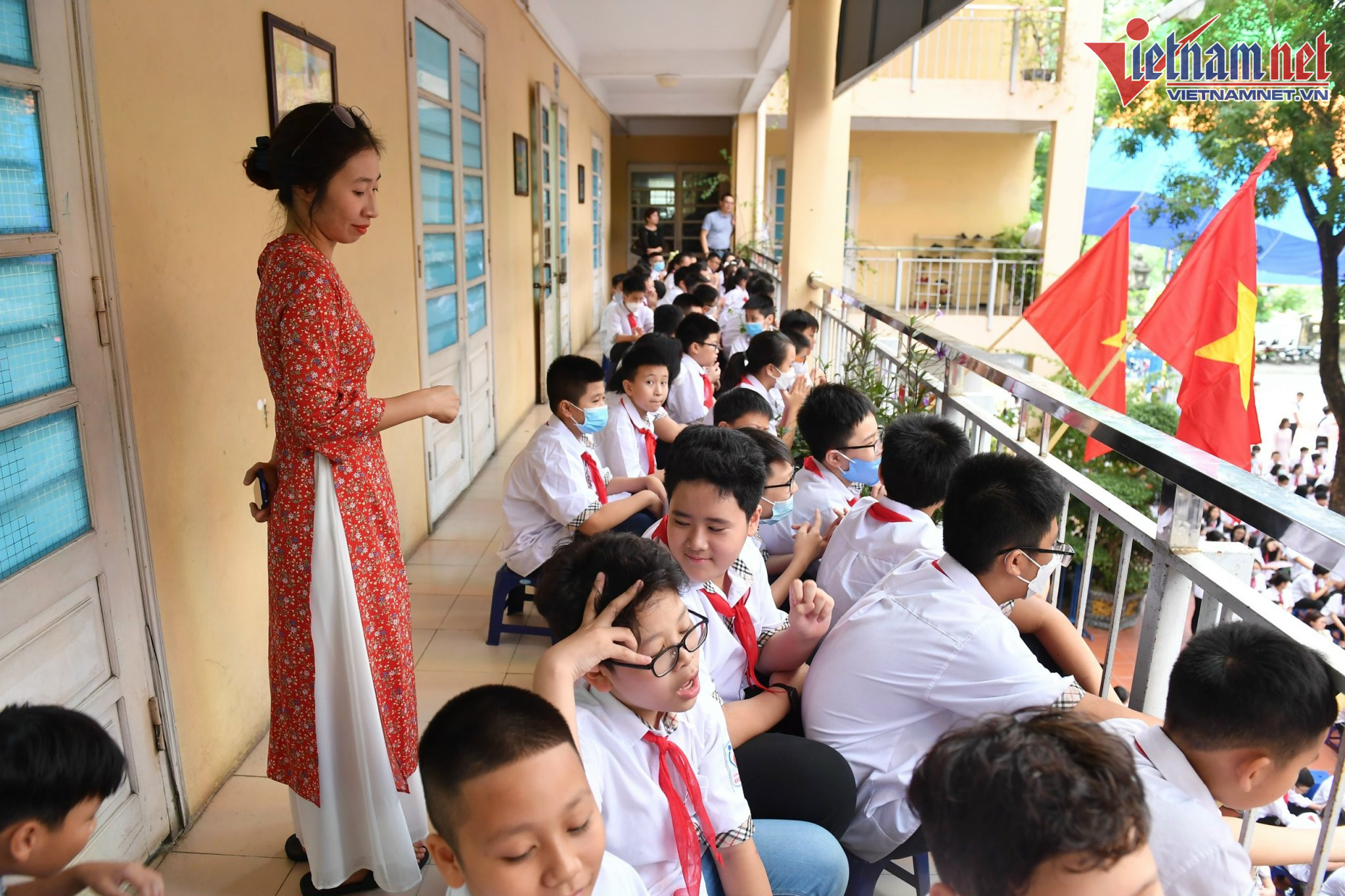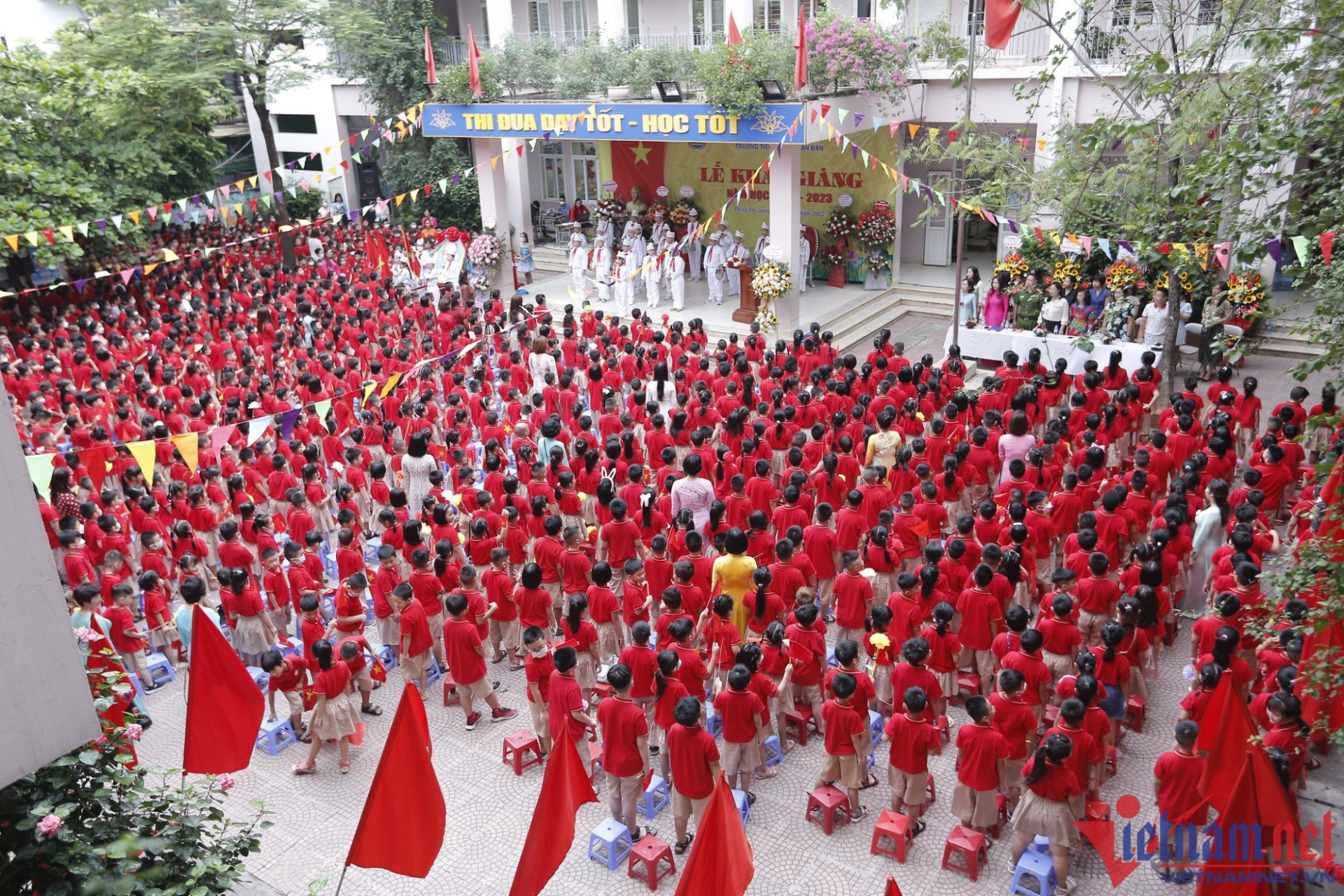 Sân Trường Tiểu học Bế Văn Đàn (Hà Nội) rực màu cờ hoa. Cô Mai Tố Quyên - Hiệu trưởng nhà trường - cho biết: "Năm nay trường tổ chức lễ khai giảng ngắn gọn, nhẹ nhàng, đủ để các con vẫn cảm nhận được sự trang trọng và niềm vui của ngày lễ này và đảm bảo sức khỏe cho các con". Buổi khai giảng kết thúc lúc 8h, sau đó các học sinh vào lớp học bình thường. Ảnh: Chí Dũng
