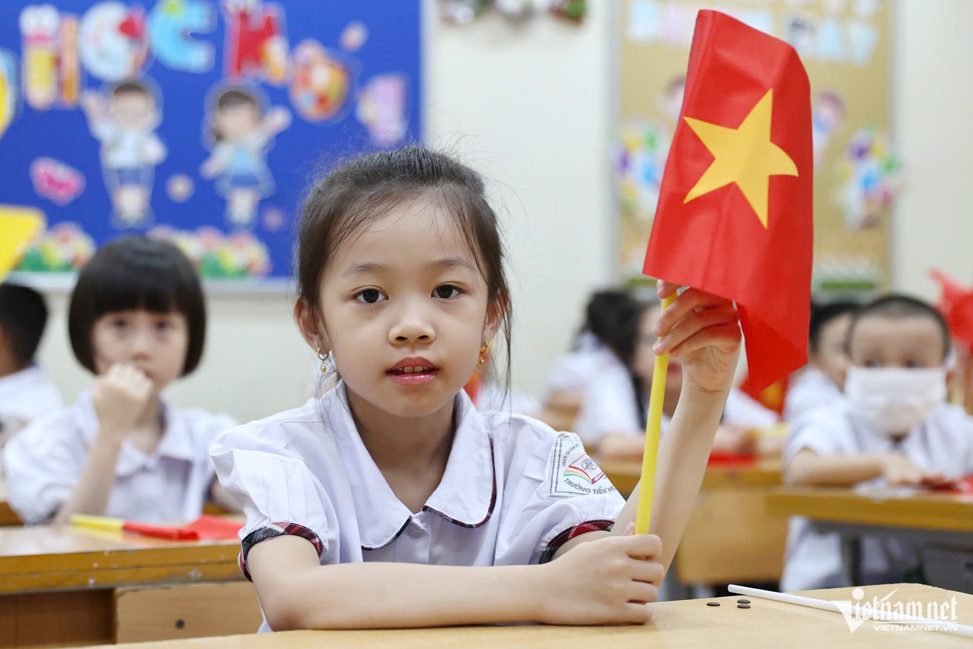Hình ảnh khai giảng tại Trường Tiểu học Linh Đàm (quận Hoàng Mai). Hiệu trưởng Tạ thị Thanh Tâm cho biết, cơ sở vật chất nhà trường khang trang, sạch đẹp nhưng còn thiếu nhiều phòng, các em phải học luân phiên.