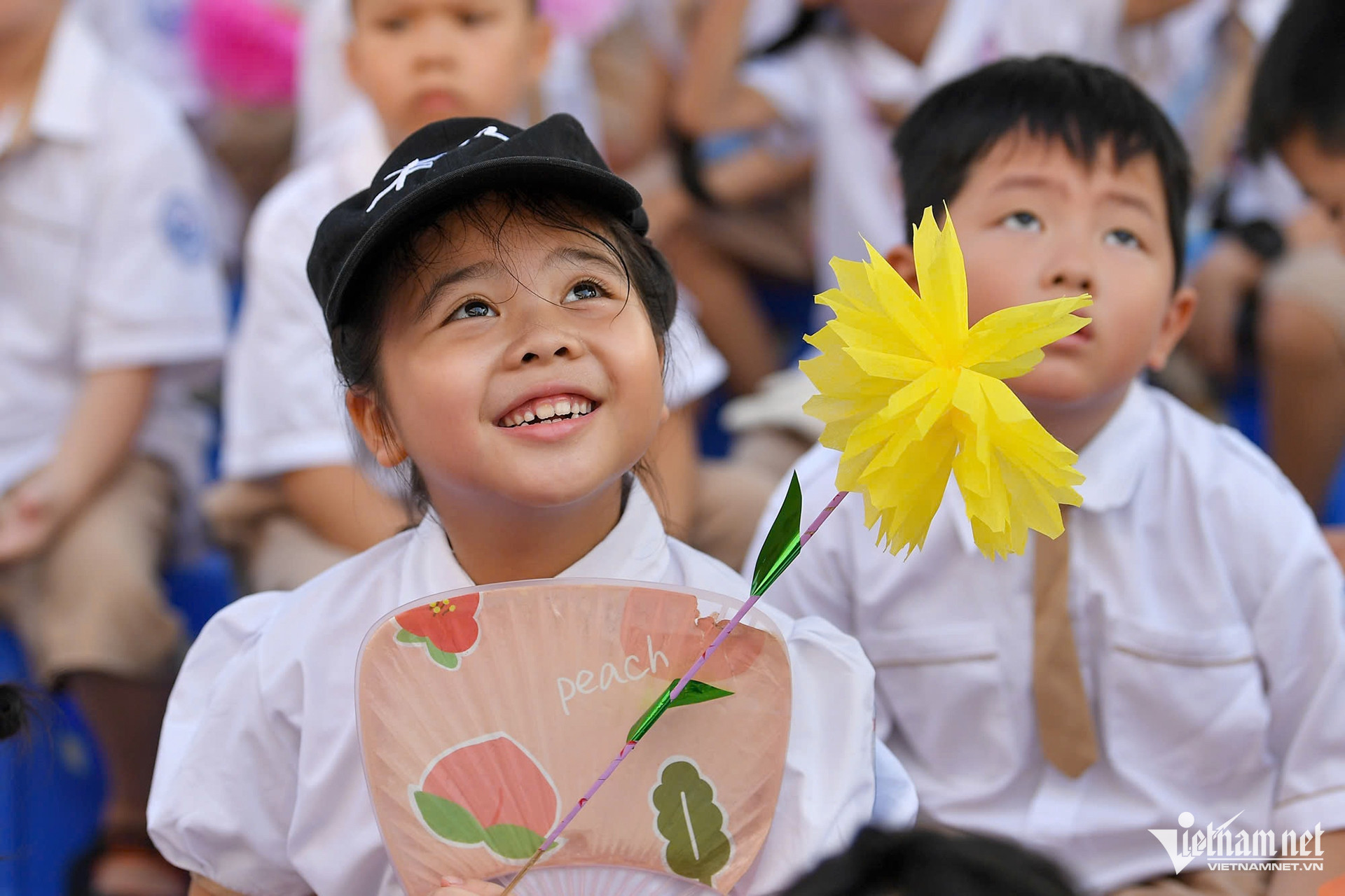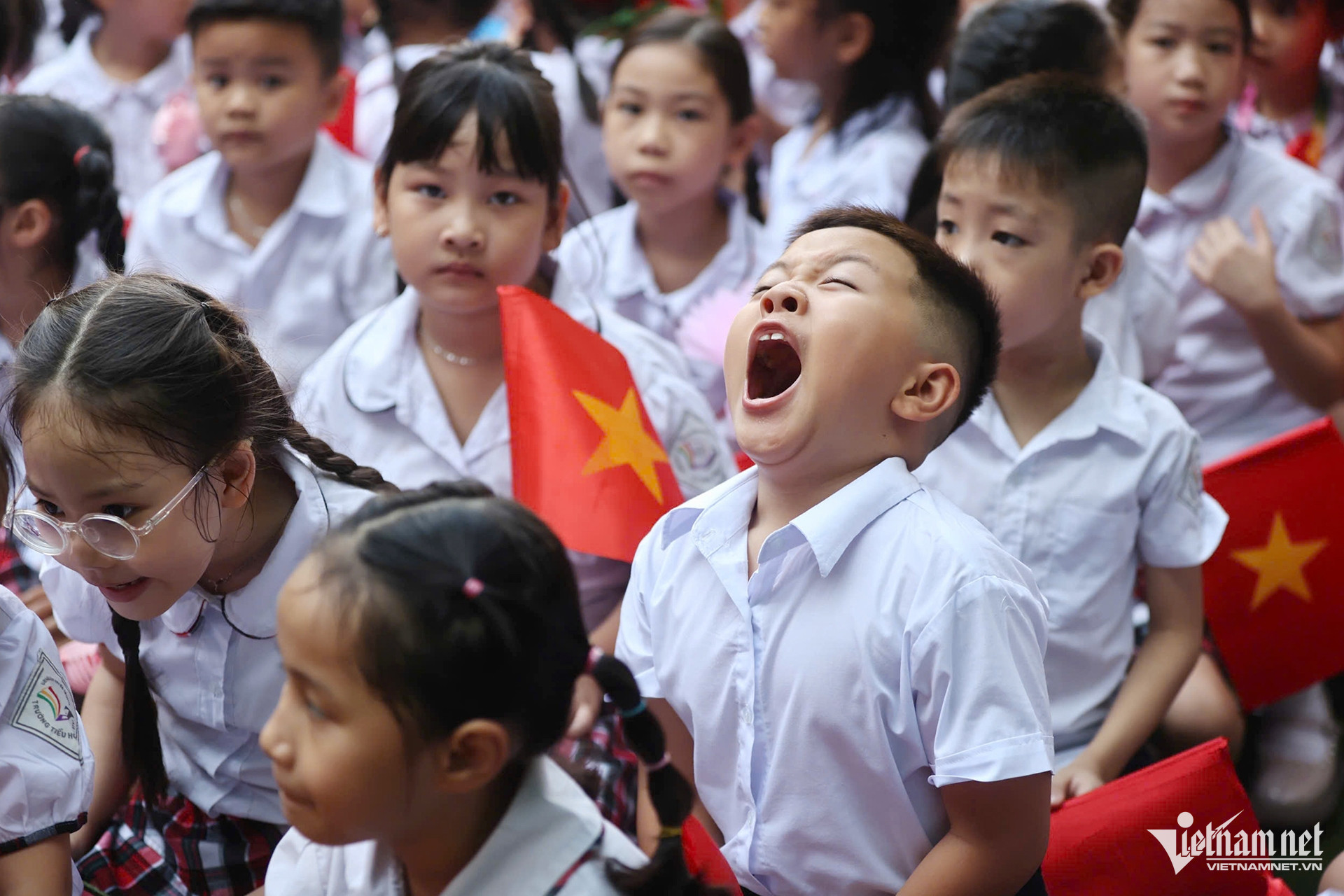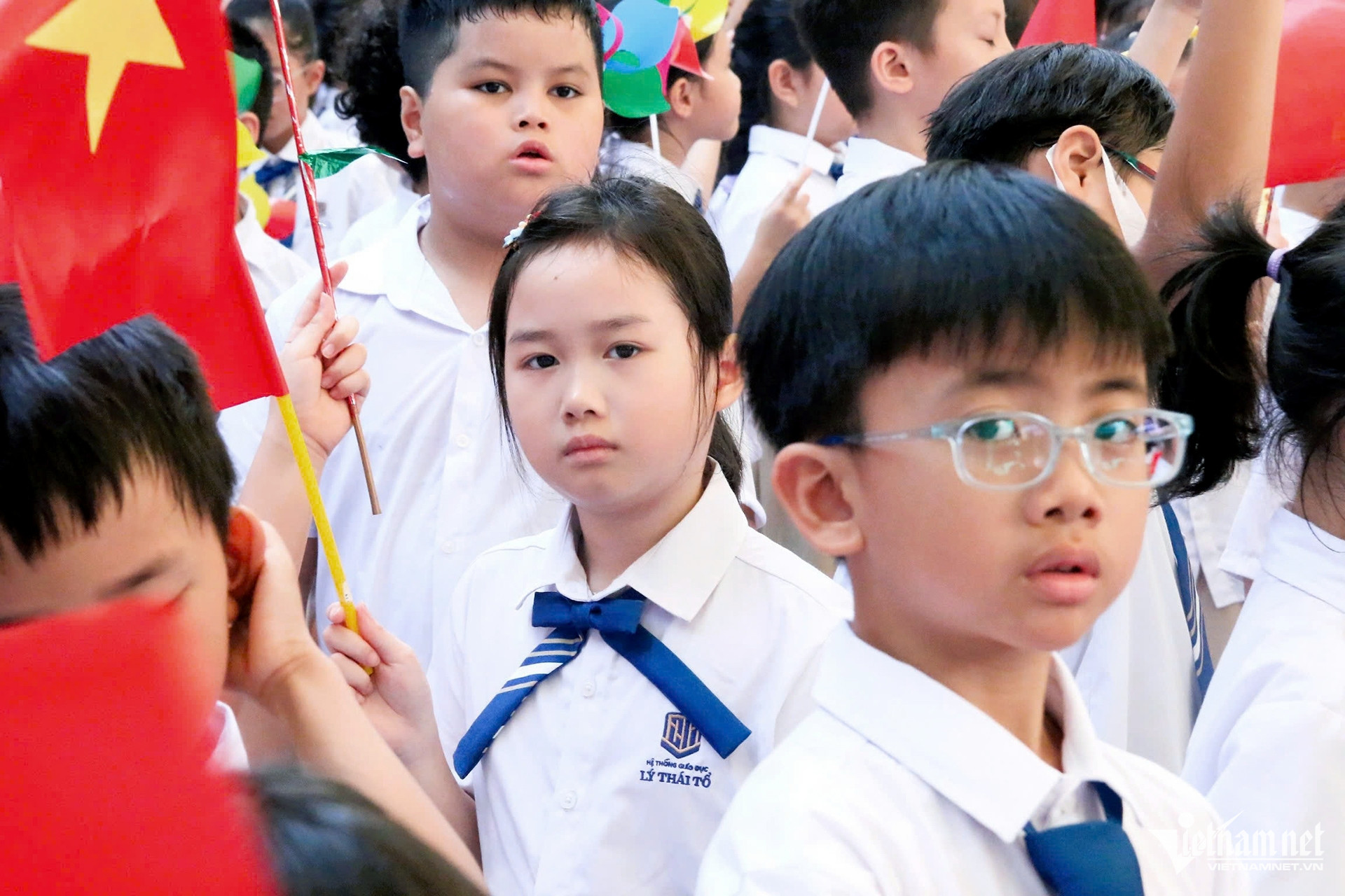 7h học sinh đã có mặt đông đủ tại sân trường, chuẩn bị cho lễ khai giảng bắt đầu vào 7h30. Ảnh: Thạch Thảo