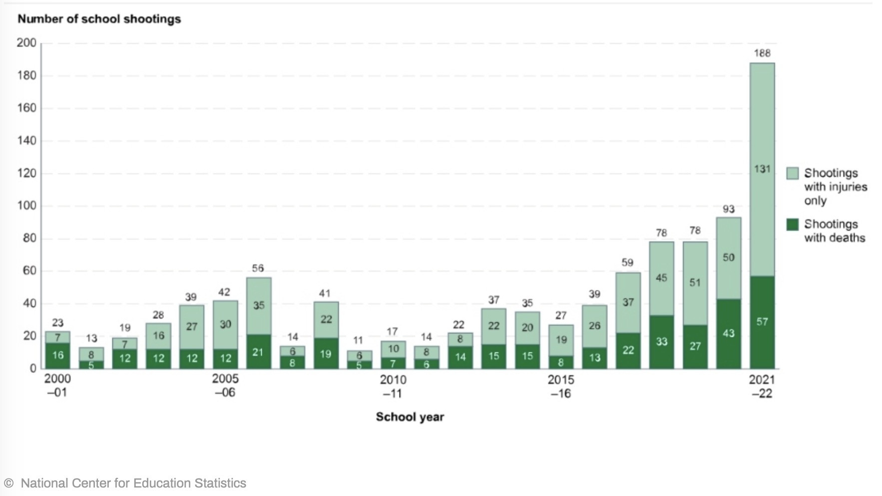 Gần đây, Trung tâm Thống kê Giáo dục quốc gia (NCES) đã công bố báo cáo an toàn và tội phạm hàng năm. Theo đó, trong năm học 2021-2022, có 188 vụ nổ súng gây thương vong trong trường học, cao gấp đôi số vụ việc được ghi nhận một năm trước đó. Các vụ xả súng hàng loạt đã gia tăng trong thập kỷ qua, với 273 vụ xảy ra trong năm 2014.