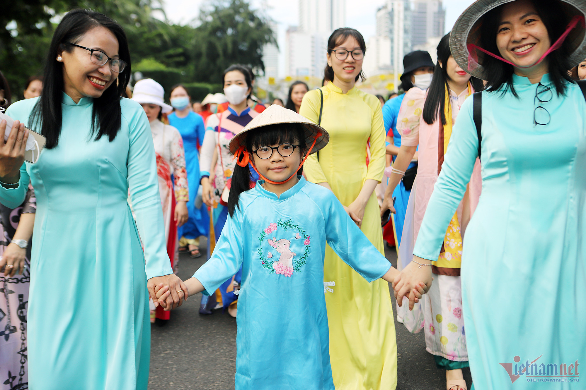 Trẻ em cũng được người lớn sửa soạn áo dài để tham gia diễu hành.