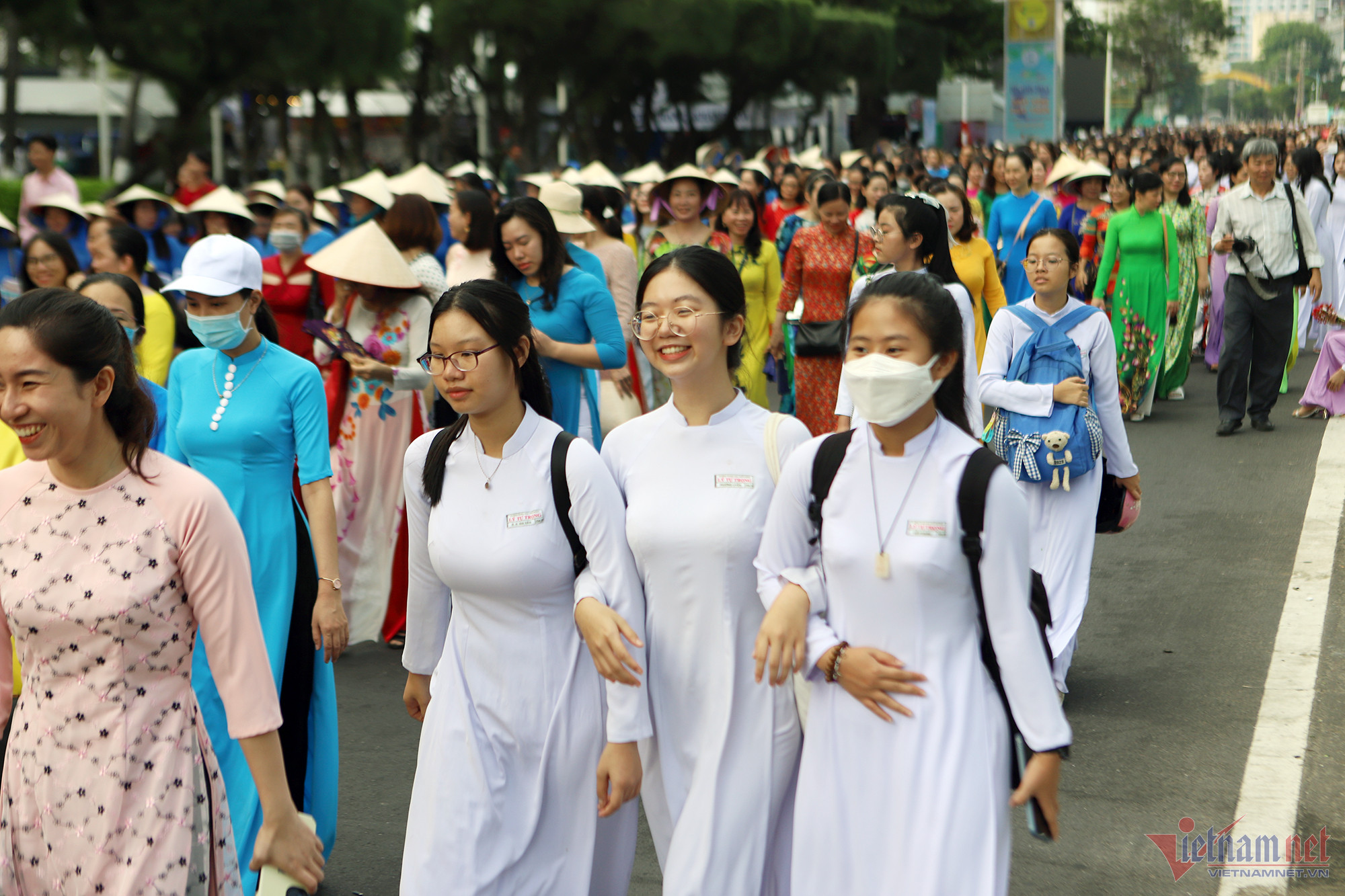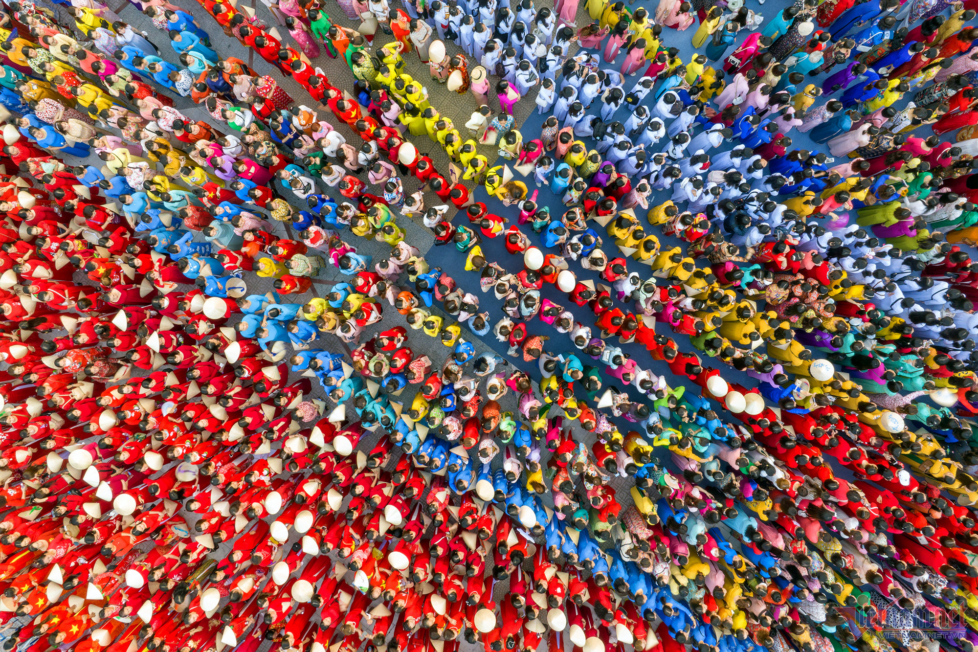 Sáng 4/6, hơn 6.000 người trong trang phục áo dài truyền thống và cách tân tập trung tại Quảng trường, TP Nha Trang để cùng diễu hành “Tôn vinh áo dài – di sản văn hóa Việt Nam”. Sự kiện do Liên hiệp Phụ nữ tỉnh Khánh Hòa tổ chức, nằm trong các hoạt động của Festival biển Nha Trang 2023. Ảnh: Vương Mạnh Cường - Xuân Ngọc.