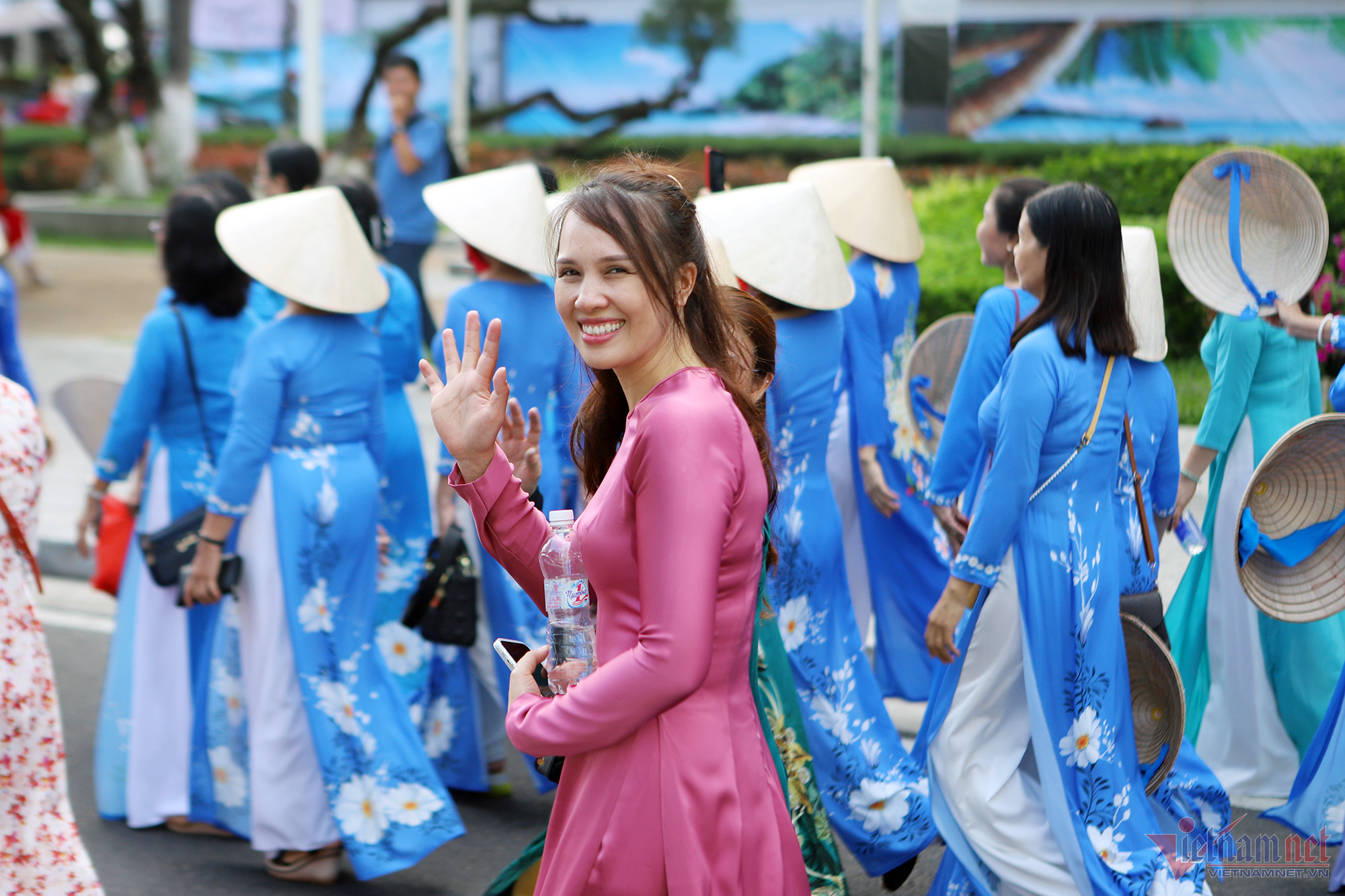 “Mặc trên mình chiếc áo dài để tham dự chương trình này em rất vui và tự hào”, Lê Thị Ngọc Hảo (tay vẫy nón) chia sẻ và cho biết hàng trăm người là đồng nghiệp làm chung công ty với cô cũng tham gia hoạt động này.
