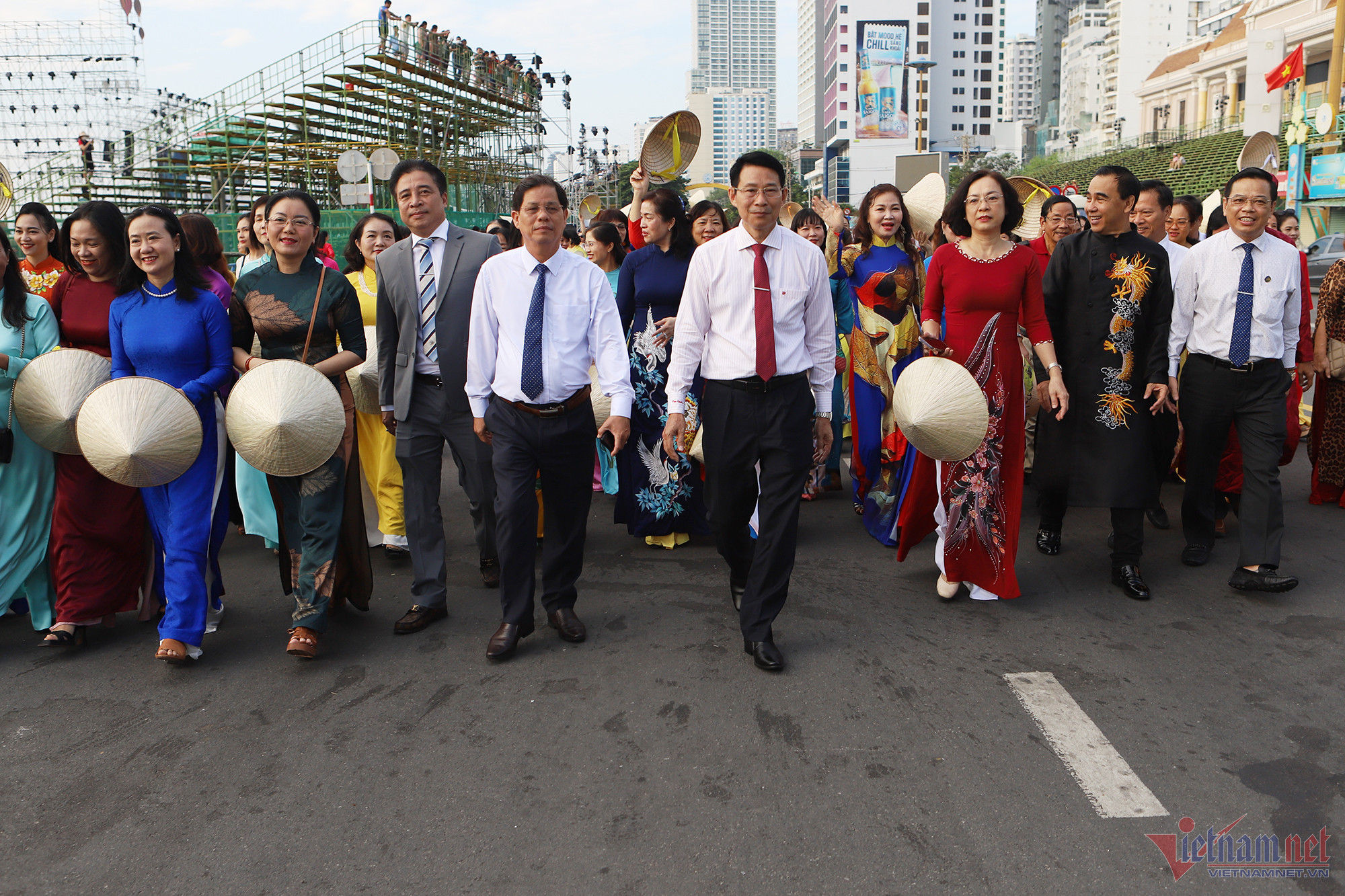 Hơn 6.000 người cùng đồng diễn áo dài trên cung đường giáp biển, nơi trung tâm của thành phố, được ghi nhận lần đầu tiên có số lượng đông nhất. Ảnh: Vương Mạnh Cường.
