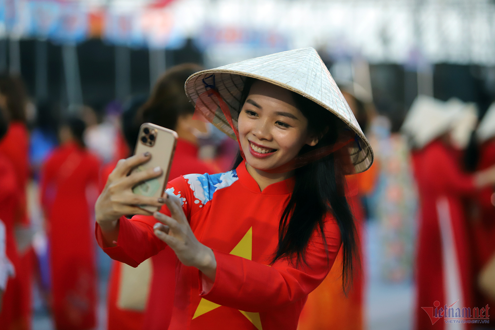 Có mặt tại Quảng trường khá sớm, những người tham gia diễu hành rạng rỡ trong tà áo dài. Nhiều người chọn áo dài có màu đỏ, đội nón lá để tôn lên vẻ đẹp của người phụ nữ Việt Nam.