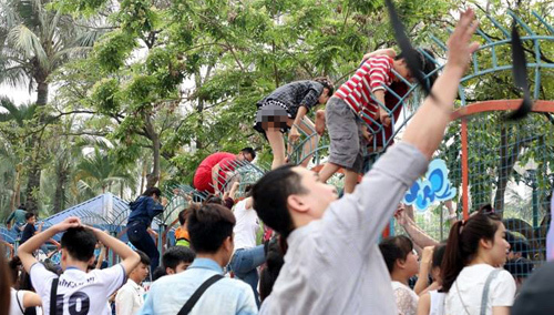 Bất chấp nguy hiểm, nhiều người cố trèo qua hàng rào sắt nhọn hoắt để vào vui chơi miễn phí tại Công viên nước Hồ Tây. Một lần nữa, từ việc miễn vé đã bộc lộ những tính cách xấu xí nơi Hà Thành.