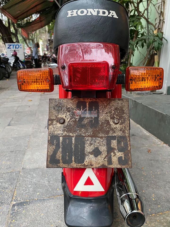 Không chỉ vậy, chiếc xe dù đã trải qua 33 năm tuổi nhưng ngoại hình xe vẫn còn rất mới, nước sơn màu đỏ tươi khá bắt mắt. Ngoại thất đều zin 100%, thậm chí một số chi tiết còn bọc nylon mới cứng như vừa đập hộp. Duy chỉ có một điểm nhấn, in hằn dấu vết thời gian lộ rõ trên chiếc xe không thể phủ nhận đó là biển số xe được làm bằng sắt và dường như đã bị rỉ sét đi rất nhiều.