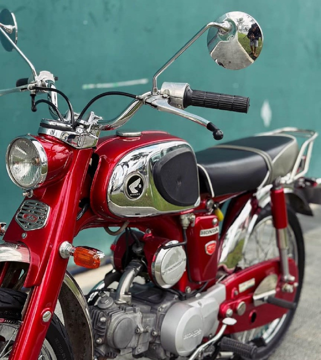 Ngoài ra anh Nghĩa còn phối thêm những điểm nhấn tinh tế trên xe như: đèn lái sau của dòng xe Honda S65, bảo vệ bình xăng con của Honda S90, cặp kính hậu của CD50S, bộ xi nhan trước sau của xe Takegawa giúp xe nhìn cân đối, cứng cáp.