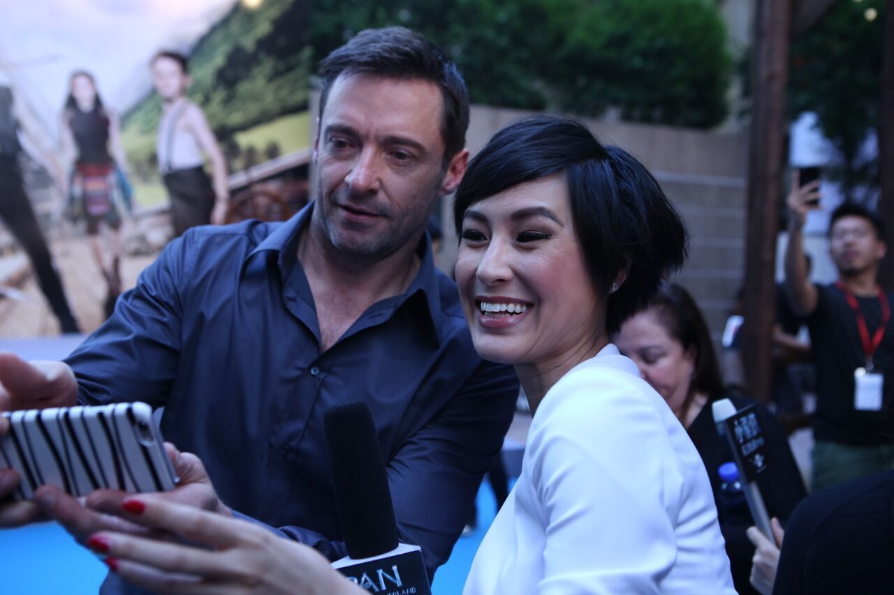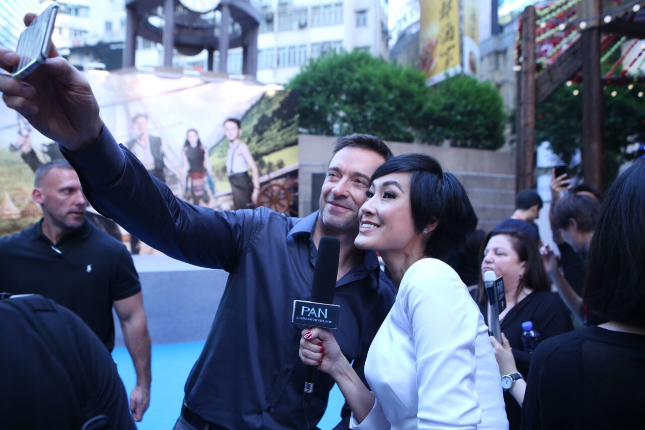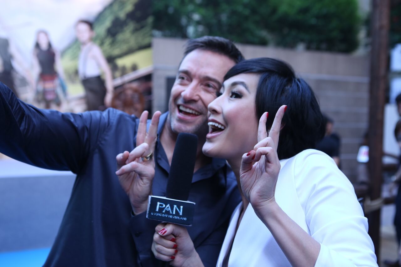 | Trên thảm đỏ, Hugh Jackman vui vẻ nhận lời chụp hình selfie với nữ diễn viên Việt Nam. |