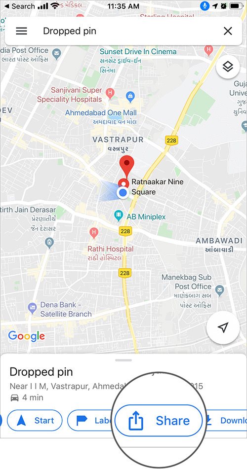 Một con dấu ghim màu đỏ sẽ hiện lên trên bản đồ. Bạn có thể bấm Save để đánh dấu địa điểm ngay, sau đó bấm vào nút Share để chia sẻ vị trí này với bạn bè.