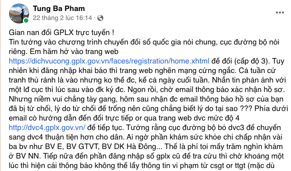 Lý giải tình trạng những ngày gần đây người dân khó đăng ký đổi giấy phép lái xe qua mạng, Cục Đường bộ Việt Nam cho biết, hệ thống đòi hỏi người dân phải sử dụng 1 số căn cước công dân/ chứng minh thư (CCCD/CMT), số điện thoại duy nhất để đăng ký tài khoản lên Cổng Dịch vụ công Quốc gia, đăng ký khám sức khoẻ…
