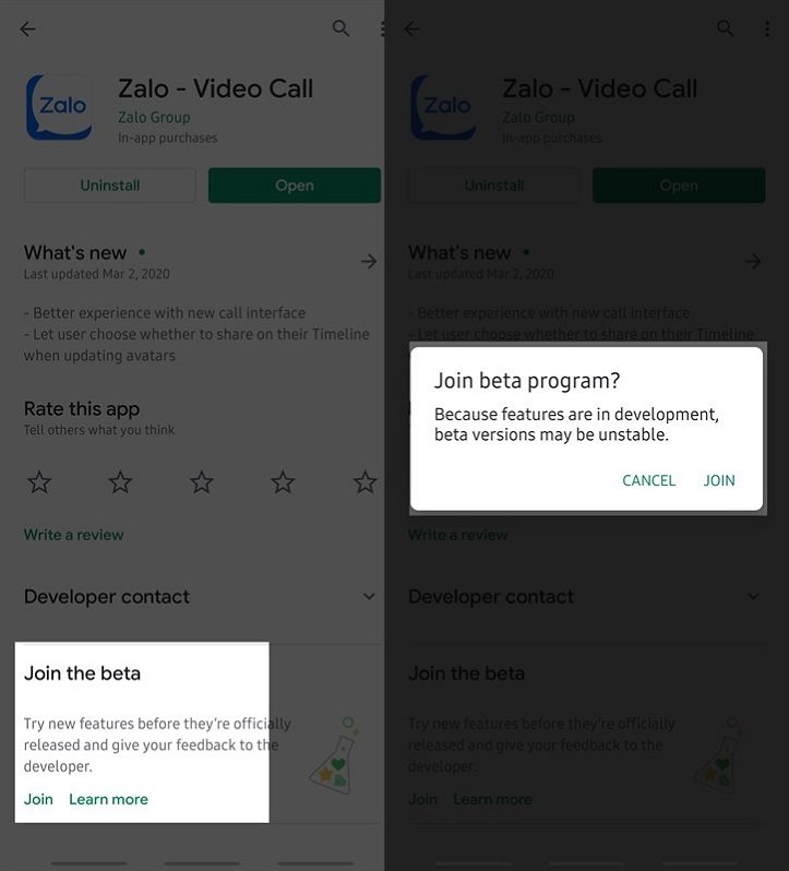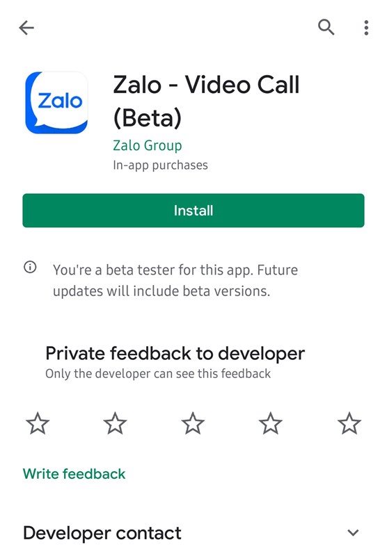 Sau khi chọn tham gia chương trình bạn thoát Google Play ra, đợi tầm 15 phút để hoàn tất đăng ký rồi vô lại. Khi đăng ký thành công bạn sẽ thấy tên app Zalo trong Google Play sẽ kèm dòng chữ beta. Bây giờ bạn gỡ cài đặt Zalo và cài đặt lại.
