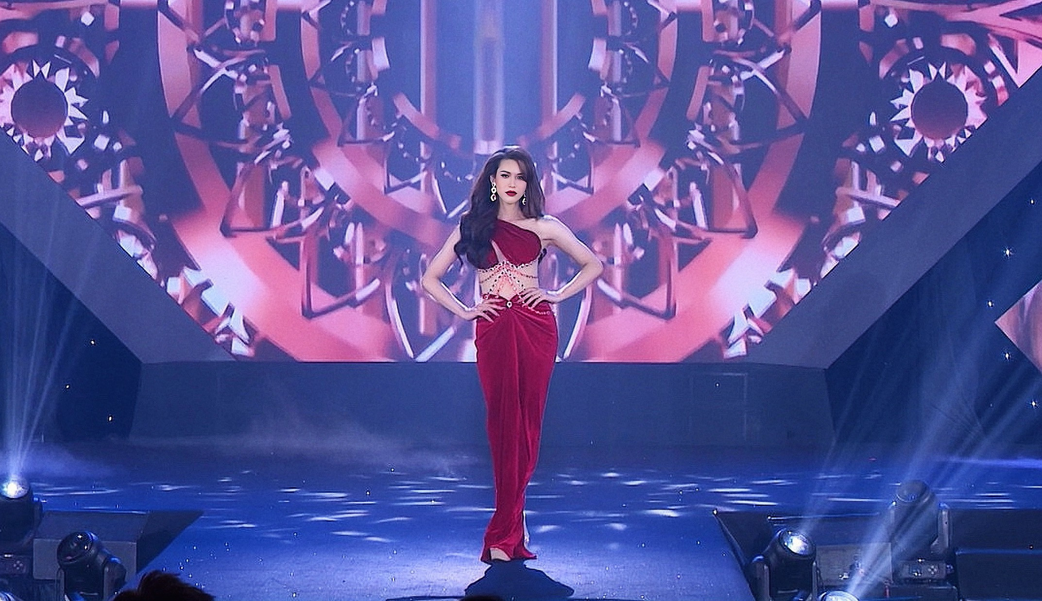 Khép lại phần thi tài năng, 12 thí sinh trình diễn trang phục dạ hội. Các cô gái khoác trên mình những thiết kế kỳ công, tỉ mỉ, cùng kiểu dáng ôm sát, cắt xẻ táo bạo.