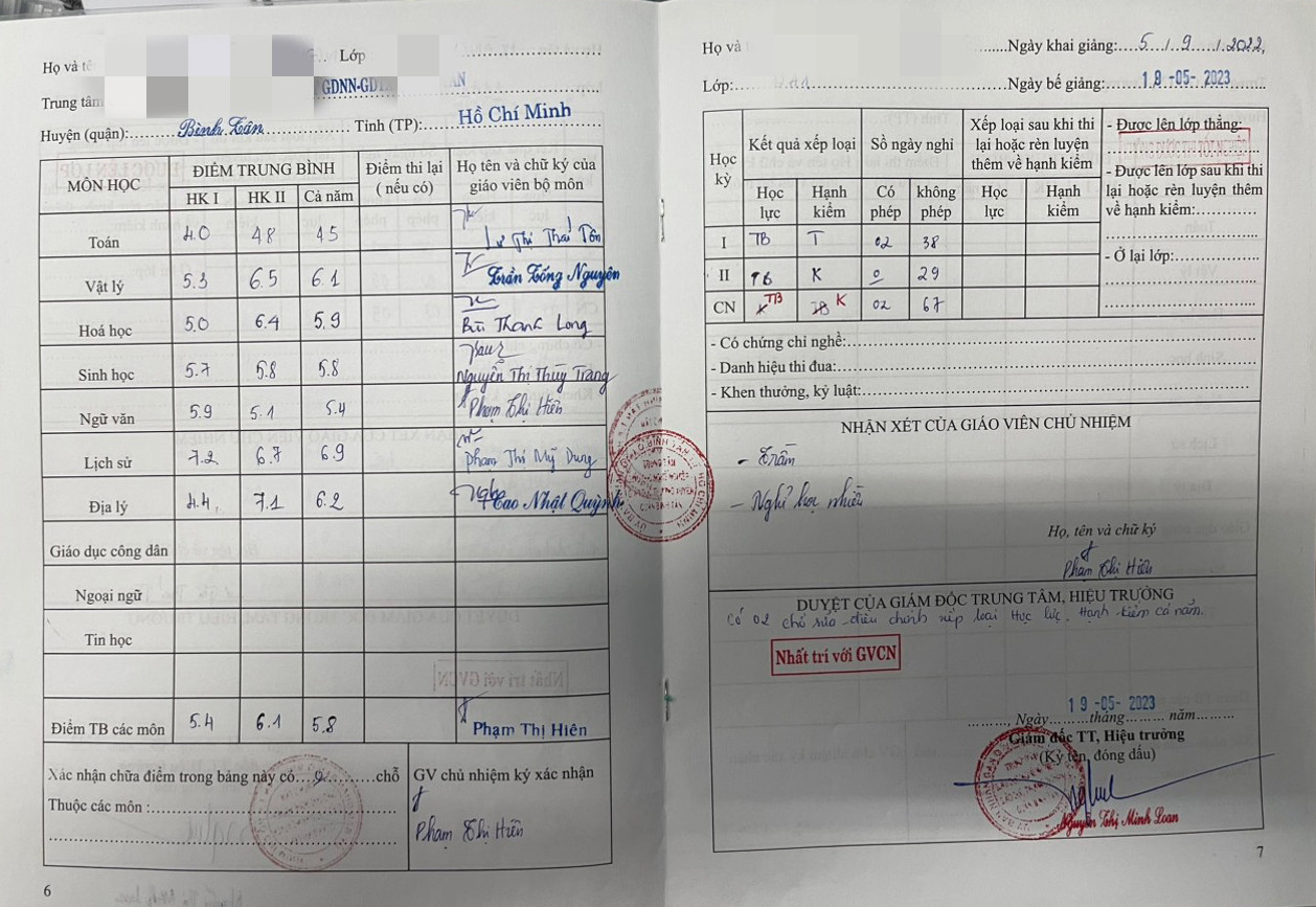 Như vậy, theo quy định này, học viên H.C.G không đủ điều kiện để tham dự kỳ thi tốt nghiệp THPT. Tại học bạ, ở phần đánh giá học viên được lên lớp thẳng hay ở lại lớp, trung tâm cũng đã đóng mộc dòng chữ: Không được thi tốt nghiệp. Học bạ được bà Nguyễn Thị Minh Loan - Phó Giám đốc (phụ trách chuyên môn) của Trung tâm GDNN-GDTX quận Bình Tân, ký tên, đóng dấu vào ngày 19/5/2023.