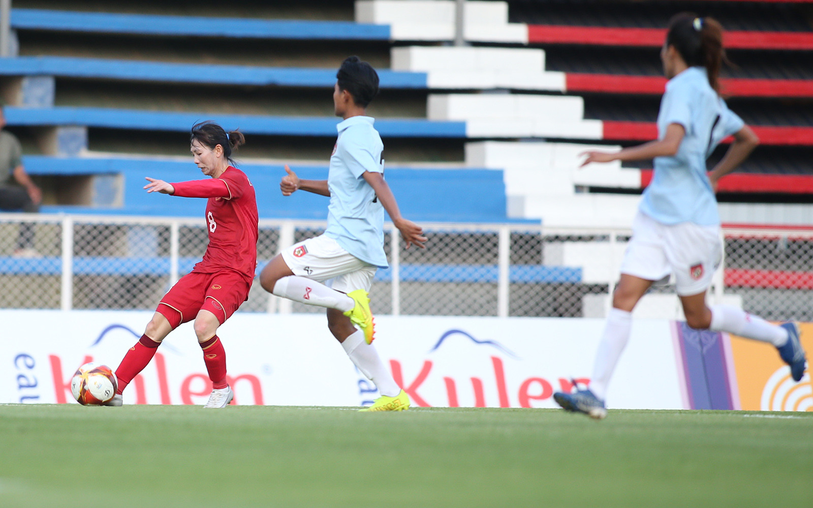 Sau trận thắng Malaysia ngày ra quân, tuyển nữ Việt Nam gặp thử thách thực sự khi chạm trán Myanmar - đội vừa có chiến thắng trước Philippines.Ở trận ra quân, Huỳnh Như chưa có bàn thắng nên cô rất quyết tâm ghi bàn đầu tiên tại SEA Games trong trận gặp MyanmarPhút thứ 10, Huỳnh Như với pha xử lý bóng cực đẳng cấp trước khi sút tung lưới Myanmar mở tỷ số trận đấu.Bàn thắng không chỉ giúp đội bóng áo đỏ khai thông bế tắc, mà còn là một kỷ lục đặc biệt với Huỳnh Như.Chân sút người Trà Vinh trở thành cầu thủ ghi bàn ở 5 kỳ SEA Games. Đây cũng là bàn thắng thứ 65 của cô cho Việt Nam.Huỳnh Như có vai trò rất quan trọng ở tuyển nữ Việt Nam.Dù bị Myanmar gỡ hòa 1-1 ở hiệp 1, nhưng sang hiệp 2, sau khi Thanh Nhã vào sân, tuyển nữ Việt Nam tiếp tục vượt lên dẫn trước 2-1."Cơn lốc đường biên" Thanh Nhã ăn mừng cùng các đồng đội.Sau khi Huỳnh Như và Tuyết Dung rời sân, "chị cả" Thuỳ Trang ghi một siêu phẩm, ấn định chiến thắng 3-1 cho tuyển nữ Việt Nam.Trần Thị Thùy Trang hạnh phúc với bàn thắng rất đẹp mắt.Tuyển nữ Việt Nam có 6 điểm sau 2 trận đấu.Ở trận cuối vòng bảng, thầy trò HLV Mai Đức Chung đối đầu với Philippines.
