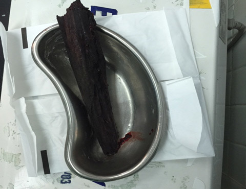 Bệnh nhân được đưa đi cấp cứu trong tình trạng cây gỗ to gần bằng cổ tay, dài 30 cm nằm ngang trong bụng, chọc thủng nội tạng.
