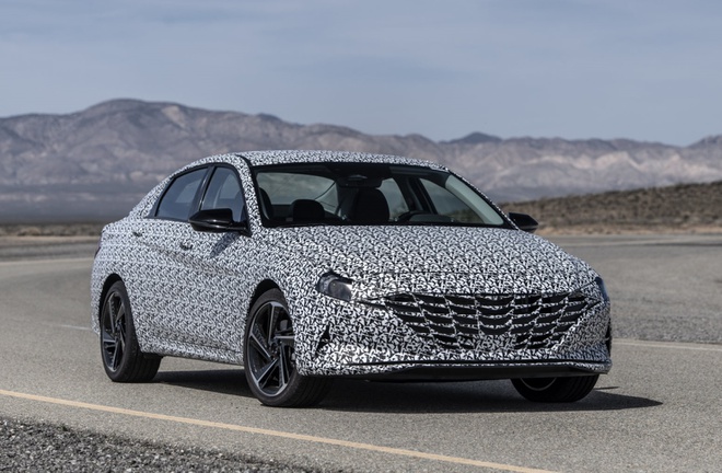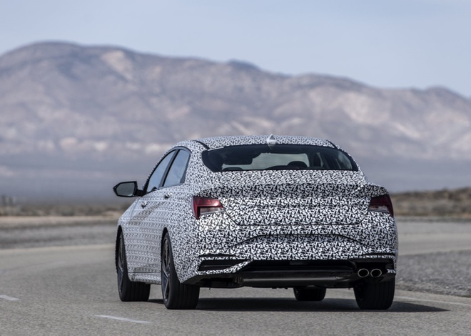 Lớp phủ ngụy trang cho thấy mặt trước và sau của sedan mới trông thể thao và dữ tợn hơn. Hyundai cũng sẽ có thêm bản Elantra N mới.