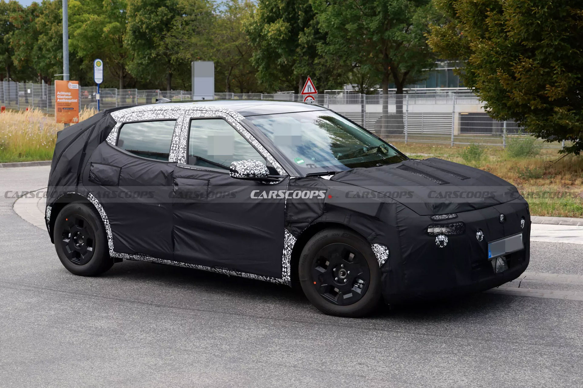 Hyundai trang bị cho nguyên mẫu bộ mâm kích cỡ vừa, bọc lốp Hankook iON GT vốn là dòng lốp mùa hè dành riêng cho xe điện cỡ nhỏ. Ở phía sau, dù vẫn còn ngụy trang, có thể thấy Hyundai Ioniq 2 sở hữu phần đuôi gần như thẳng đứng, cản sau thiết kế tối giản, cụm đèn hậu LED và cửa sổ sau cắt góc cá tính.