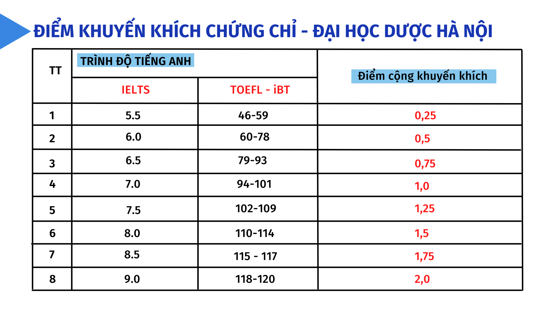 Bảng quy đổi, điểm cộng khuyến khích chứng chỉ IELTS của Trường Đại học Dược Hà Nội 2022: