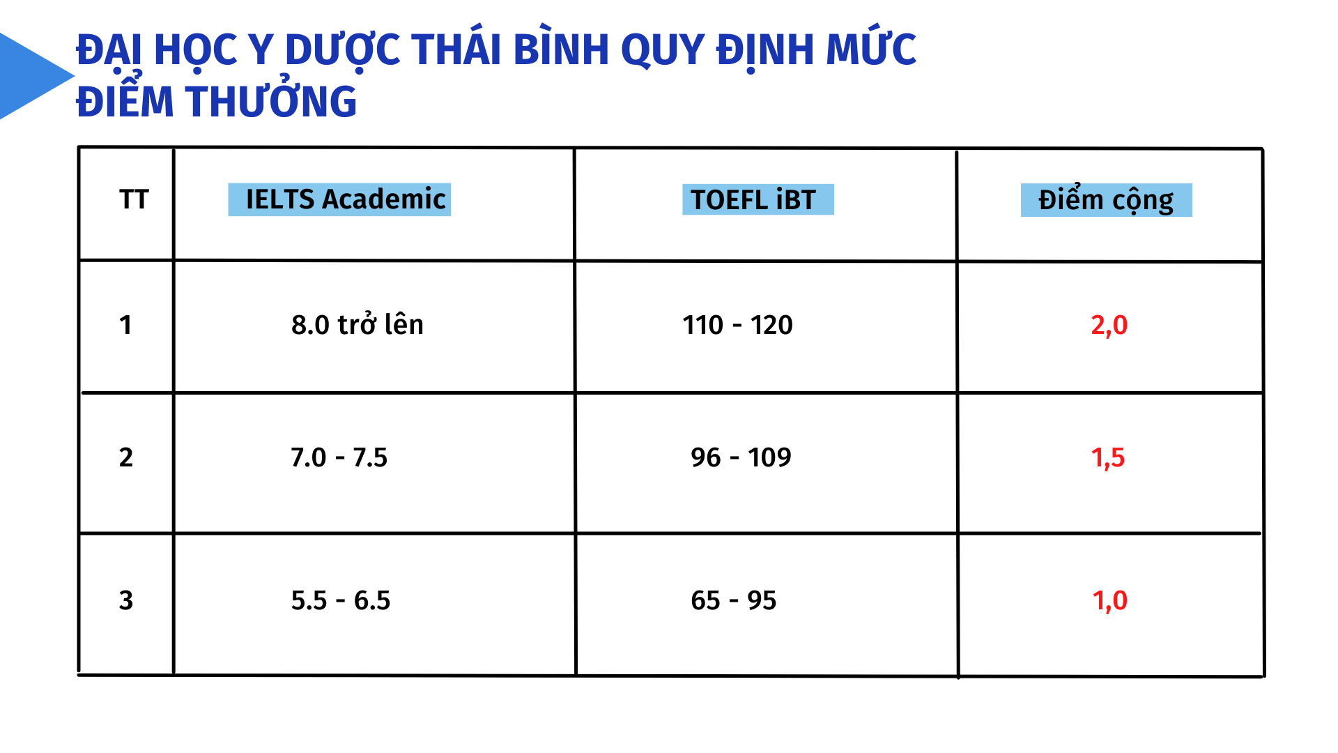 Bảng điểm cộng, quy đổi chứng chỉ IELTS của Trường Đại học Y Dược - Đại học Thái Nguyên: