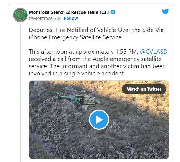 iPhone 14 trong xe đã phát hiện vụ va chạm. Do không có tín hiệu di động, thông tin được gửi đến đội cứu hộ thông qua tính năng Emergency SOS via Satellite. Các nạn nhân gửi tin nhắn tới một trung tâm chuyển tiếp (relay) của Apple. Nhân viên của trung tâm đã gọi cho Sở Cảnh sát trưởng Quận LA để xin giúp đỡ.