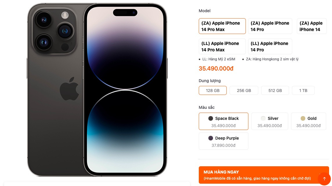 Trong khi đó, các dòng máy nhập từ Mỹ có mức giảm giá khá mạnh. Hiện tại, iPhone 14 Pro Max 128GB hàng Mỹ có giá khởi điểm 33,49 triệu đồng với các phiên bản màu đen, bạc và vàng. Còn đối với bản màu tím thì mức giá cao hơn khoảng 1,8 triệu đồng.
