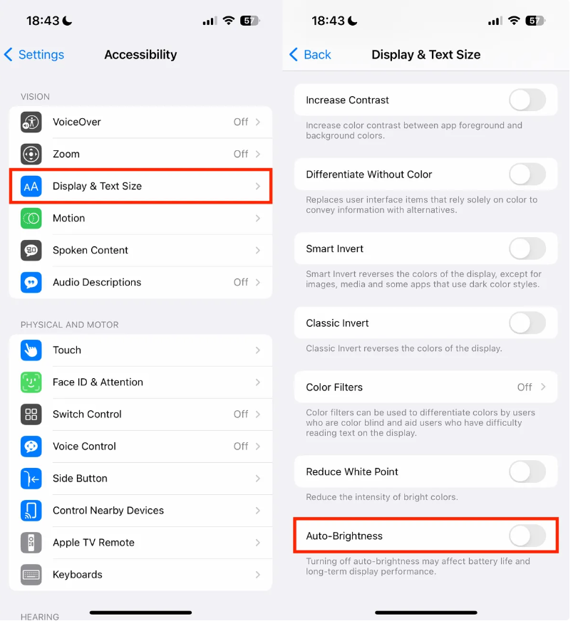 Điều đầu tiên là bạn cần phải tắt tính năng chỉnh độ sáng tự động. Vào Cài đặt (Settings) , đi tới mục Trợ năng (Accessibility) > Màn hình và Cỡ chữ (Display & Text Size) > tắt Độ sáng tự động (Auto-Brightness) ở cuối trang.