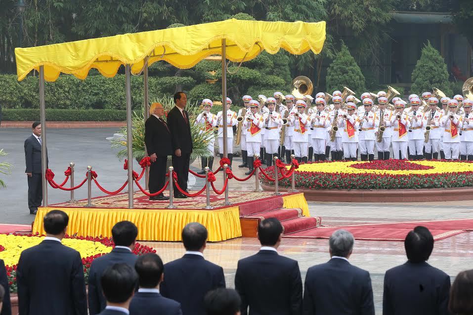 Sáng nay, lễ đón chính thức đã diễn ra tại phủ Chủ tịch với sự tham dự của Phó Thủ tướng, Bộ trưởng Ngoại giao Phạm Bình Minh, Chủ nhiệm Văn phòng Chủ tịch nước Đào Việt Trung…