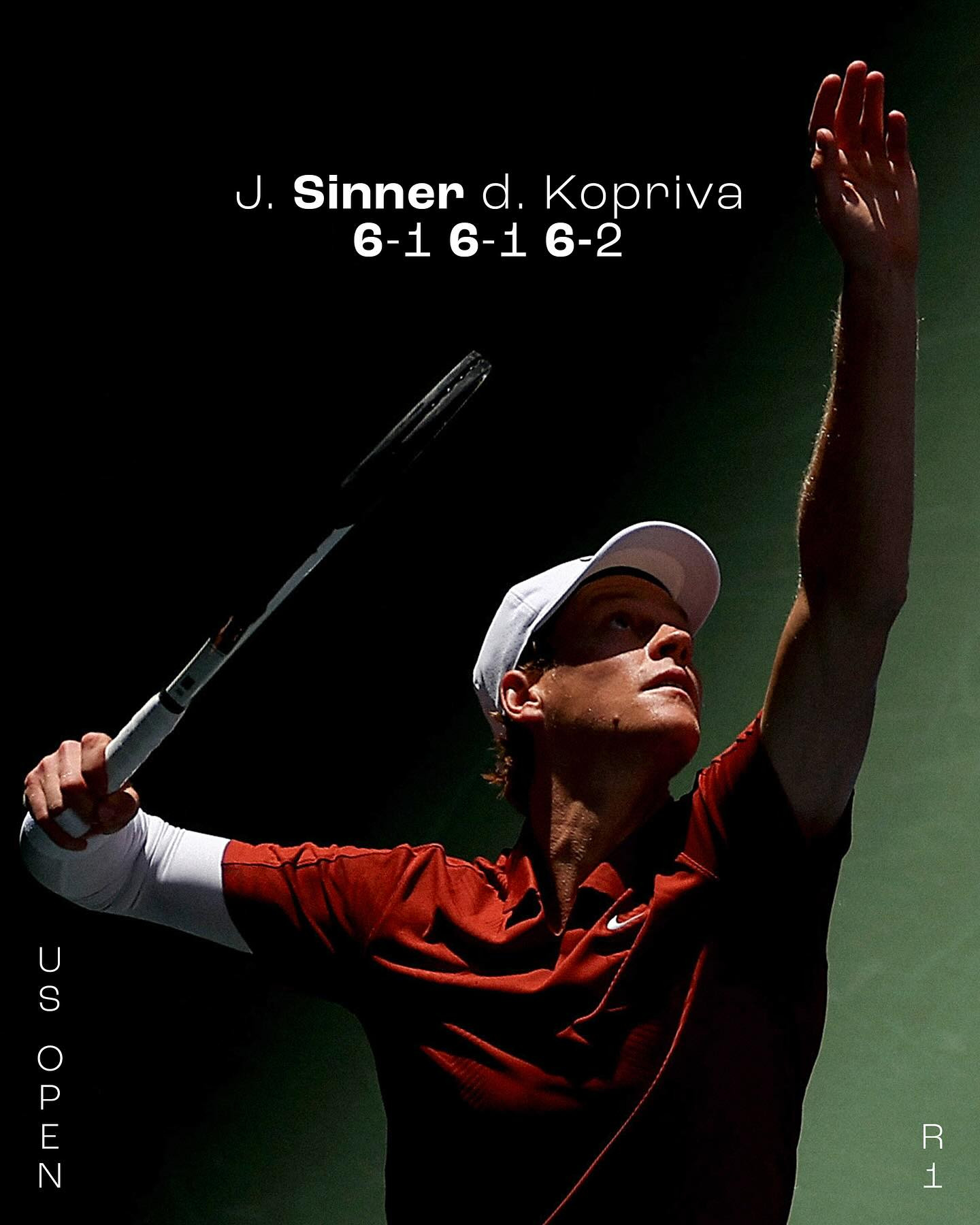 Trước đối thủ hạng 89 thế giới, Sinner nhập cuộc mạnh mẽ, dẫn 4-0 ngay trong set đầu, khiến phần lớn khán giả đến muộn chỉ kịp chứng kiến thế trận một chiều. Những cú trái tay chuẩn xác của anh nhiều lần khiến Kopriva bất lực, dù tỷ lệ giao bóng một chỉ đạt 59% vẫn là hạn chế nhỏ.